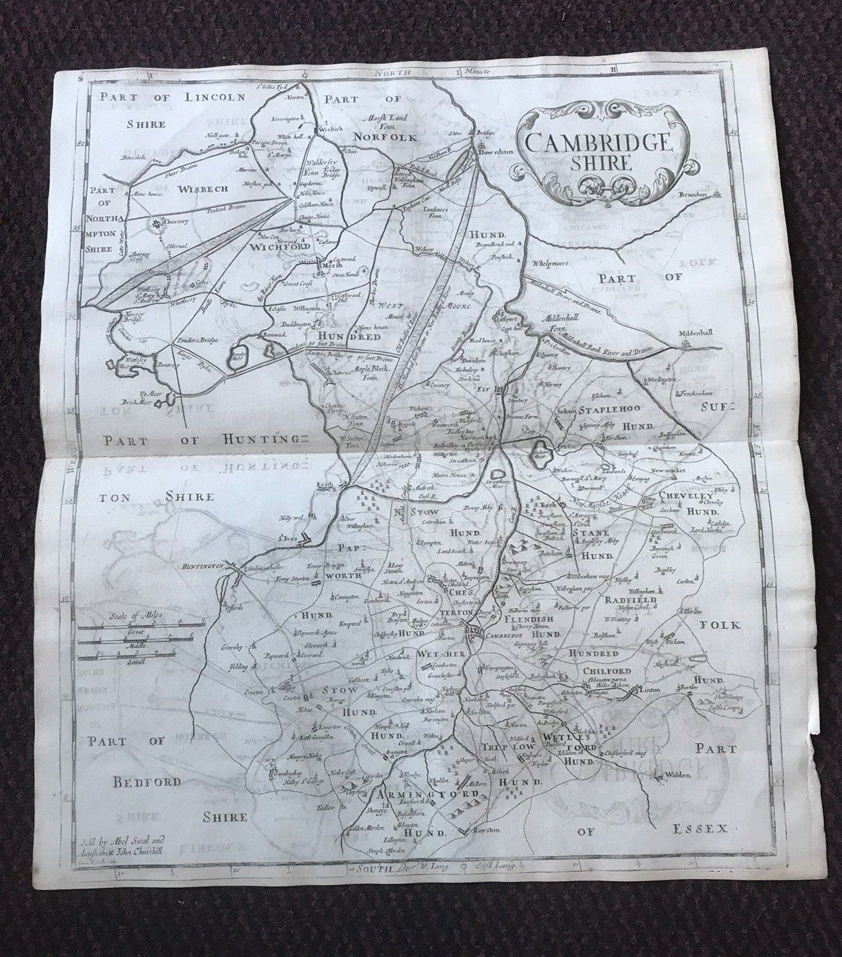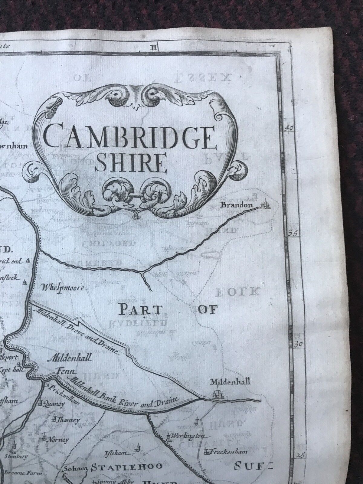 A fine and rare Copper Engraved original antique Map of Cambridgeshire with decorative Cartouche. This example is from the very rare Gibson First Edition in 1695, significantly rarer than the 1722 and later editions.