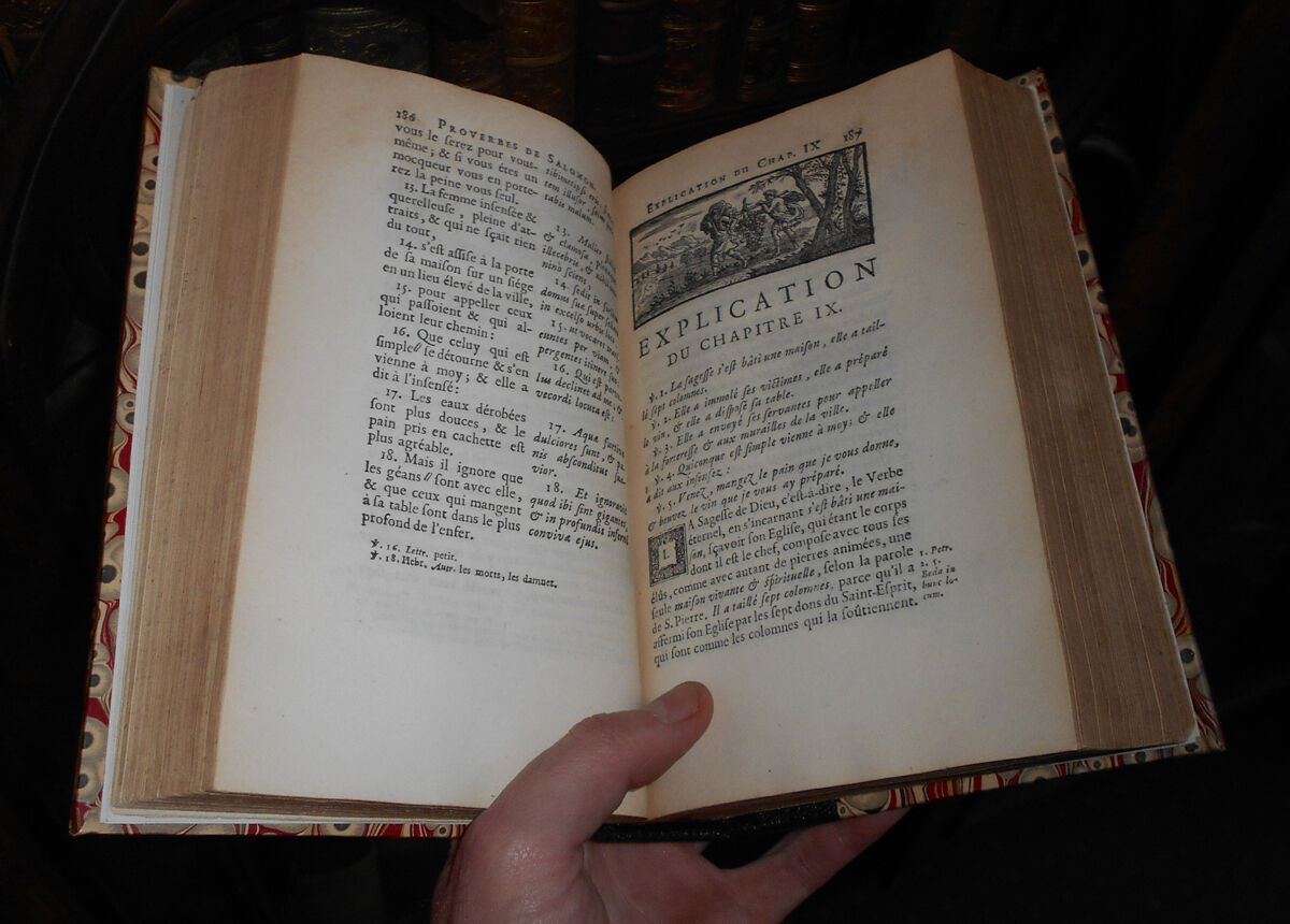8vo. Modern quarter leather binding, black goatskin spine with Italian marble sides, gilt title direct to spine and date at the foot of spine. [36], 796 pp. Title-page vignette. Engraved head and tail-pieces; initials and printed marginalia. Biblical text in Latin and French in parallel columns; commentary in French. Translated by Isaac-Louis Le Maistre de Sacy.