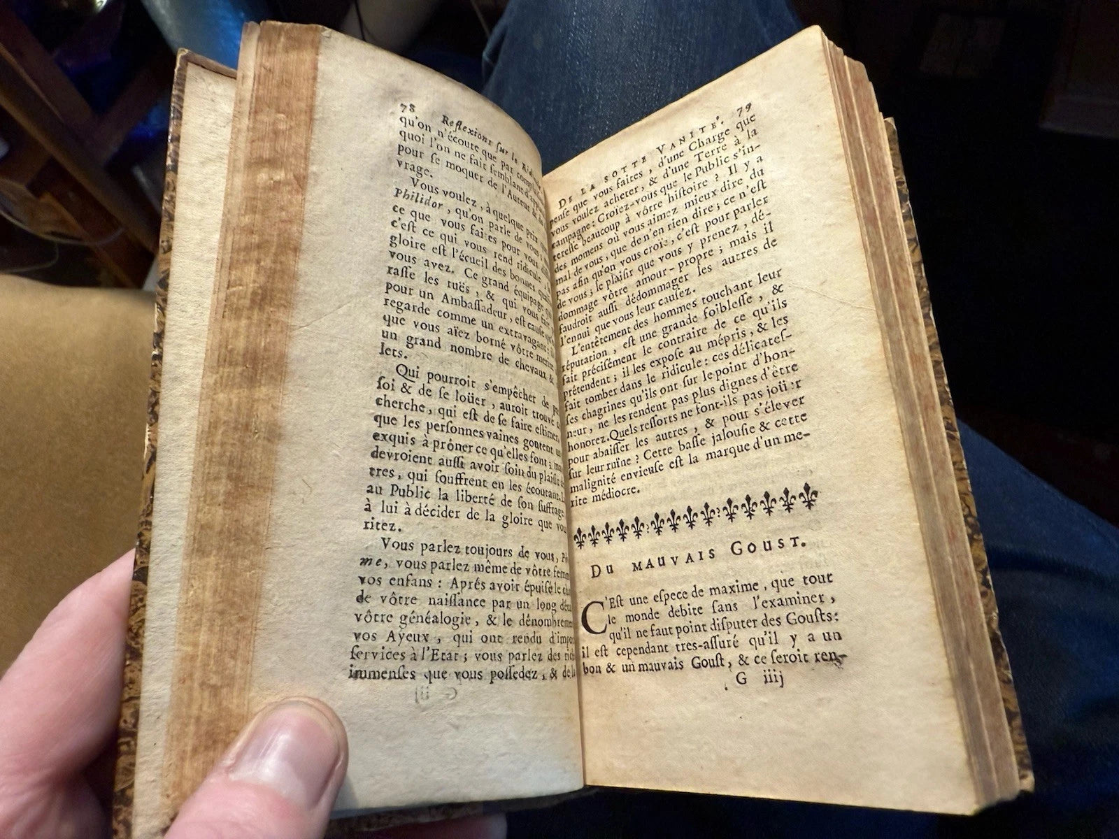 De l'Imprimerie de Son Altesse Serenissime, 1697. Third Augmented Edition. Small 8vo, original quarter leather binding with marble boards, pp vi, 176, [ii]. Language: French.