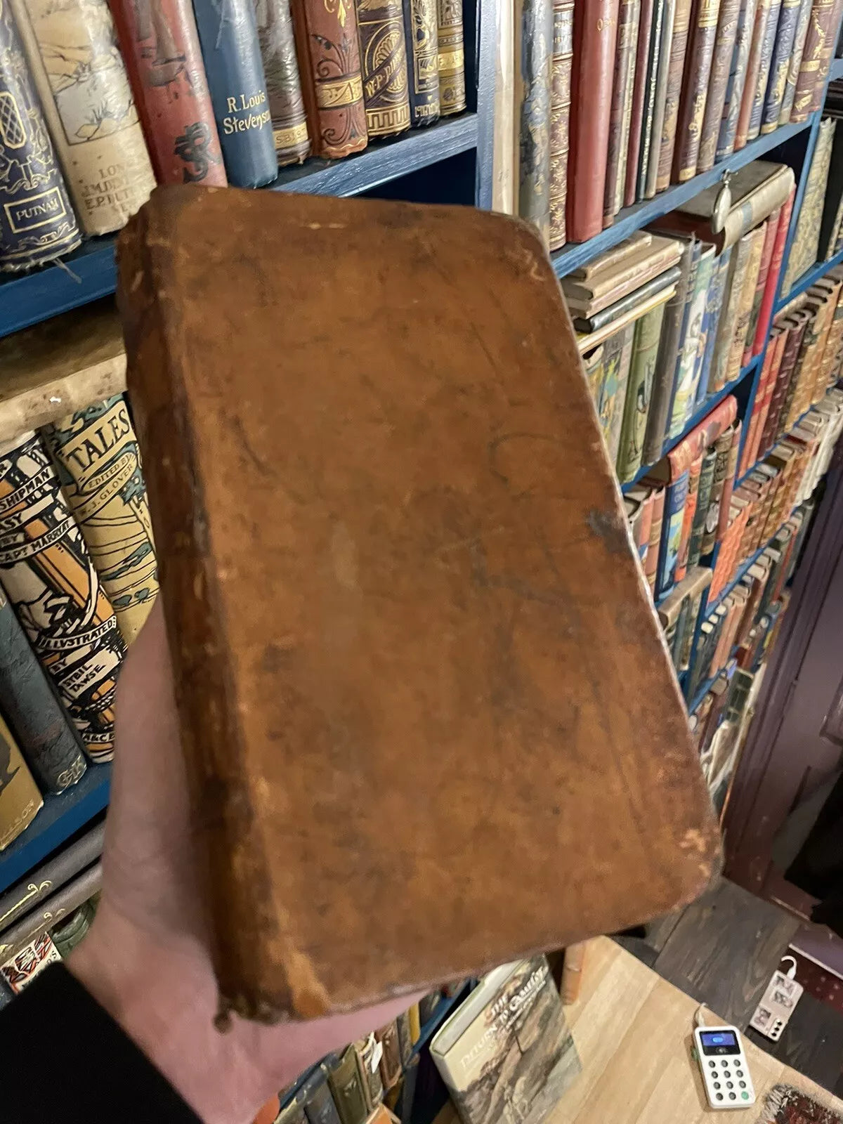 The binding of the book is in good to very good condition with expected signs of its age. There is scuffing and staining to the leather on the boards and spine and some damage and loss to the leather on the corners (mostly noticeable on the front corners). There is damage and loss of about 1/4" to the leather at the spine ends and, title label is missing.