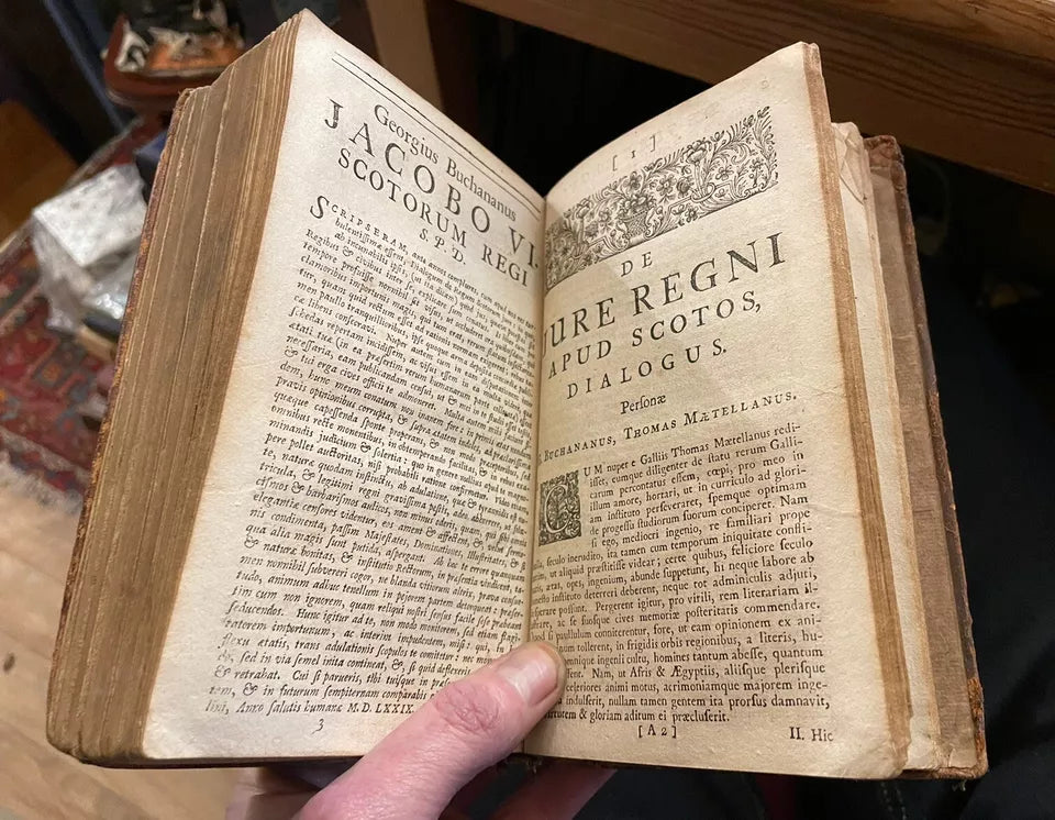 Bound in at the end of the book is Buchanan's treatise 'De Jure Regni Apud Scotos', first published in 1579. In this work, composed in the form of a dialogue, Buchanan lays down the doctrine that the source of all political power is the people, that the king is bound by those conditions under which the supreme power was first committed to his hands, and that it is lawful to resist, even to punish, tyrants. There were persistent efforts of the legislature to suppress it during the century following its publication. It was condemned by act of parliament in 1584, and again in 1664; and in 1683 it was burned by the University of Oxford.