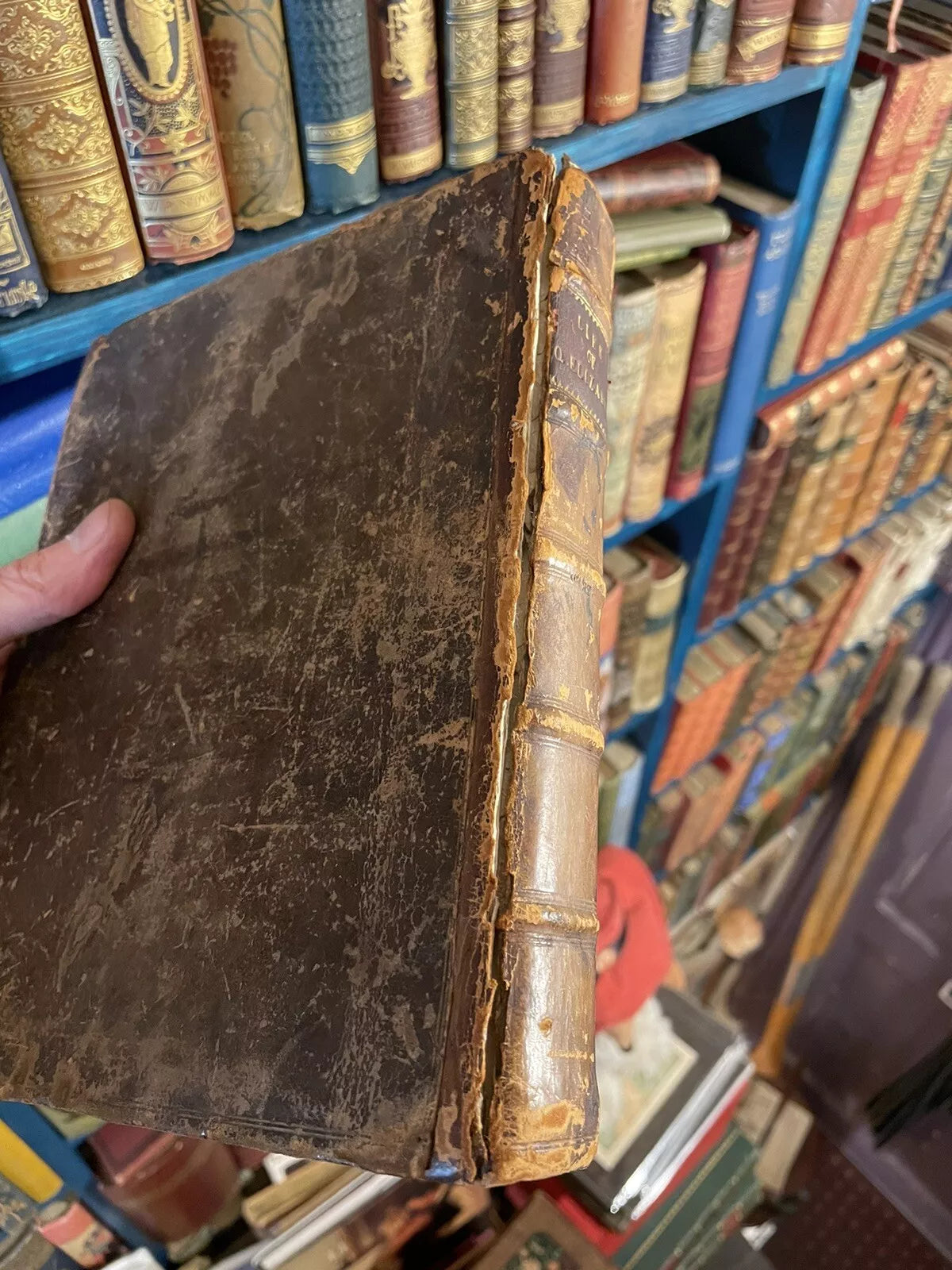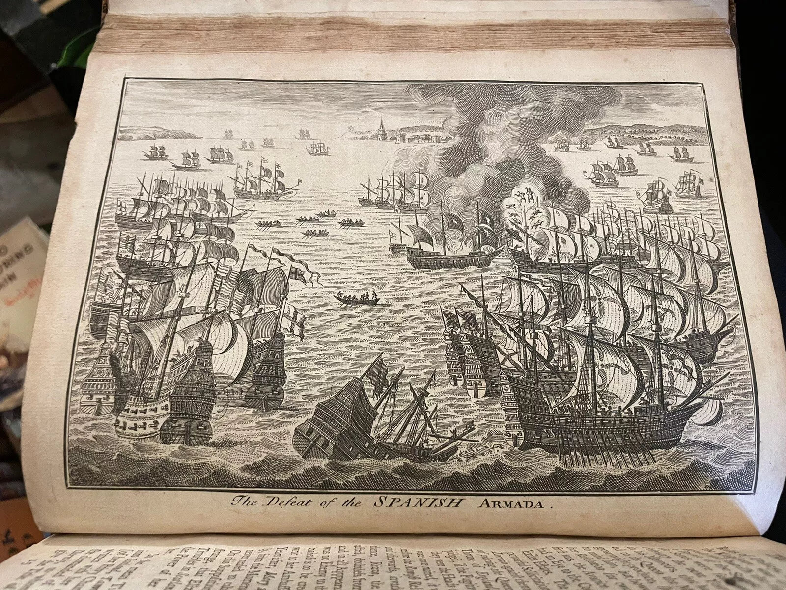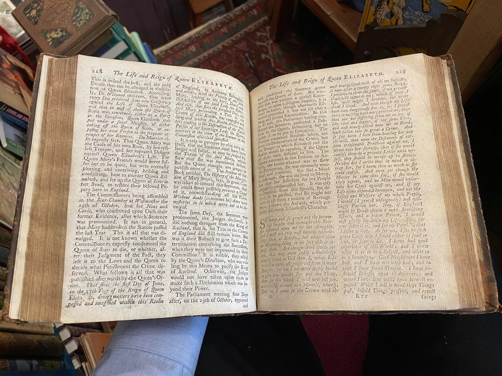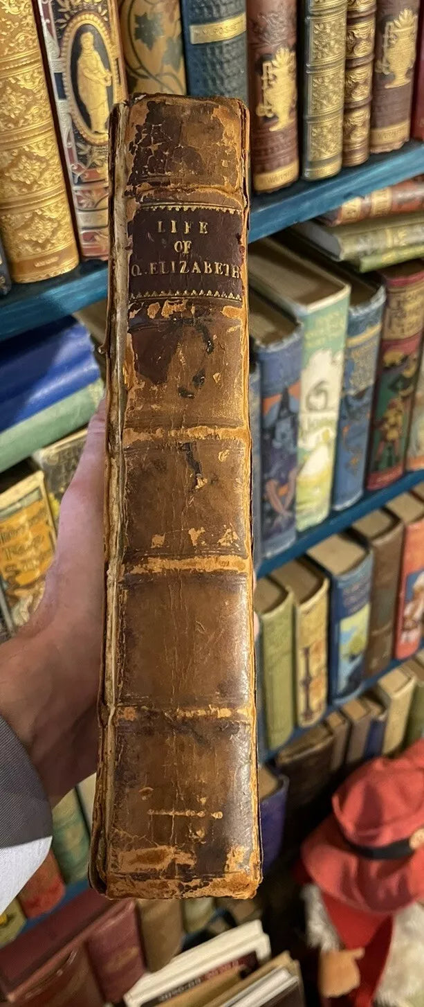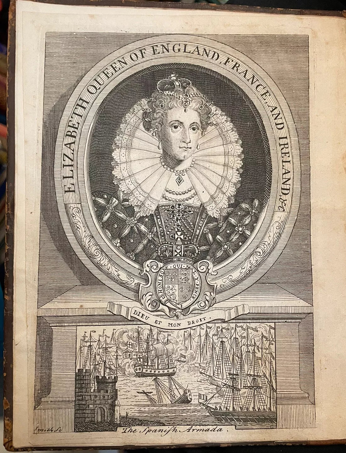 Printed, and sold by the Booksellers in Town and Country, London, 1738. Priginal full-leather binding, book measures 22 x 17cm. pp iv-5-450. Illustrated with a frontispiece (portrait of Queen Elizabeth, above a smaller illustration of the Spanish Armada), plus a further plate between pages 96 and 97, titled "The Defeat of the Spanish Armada".