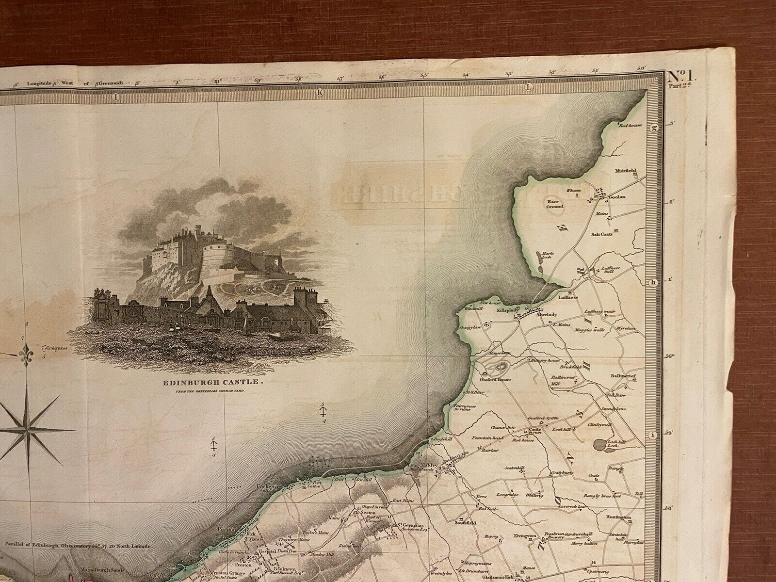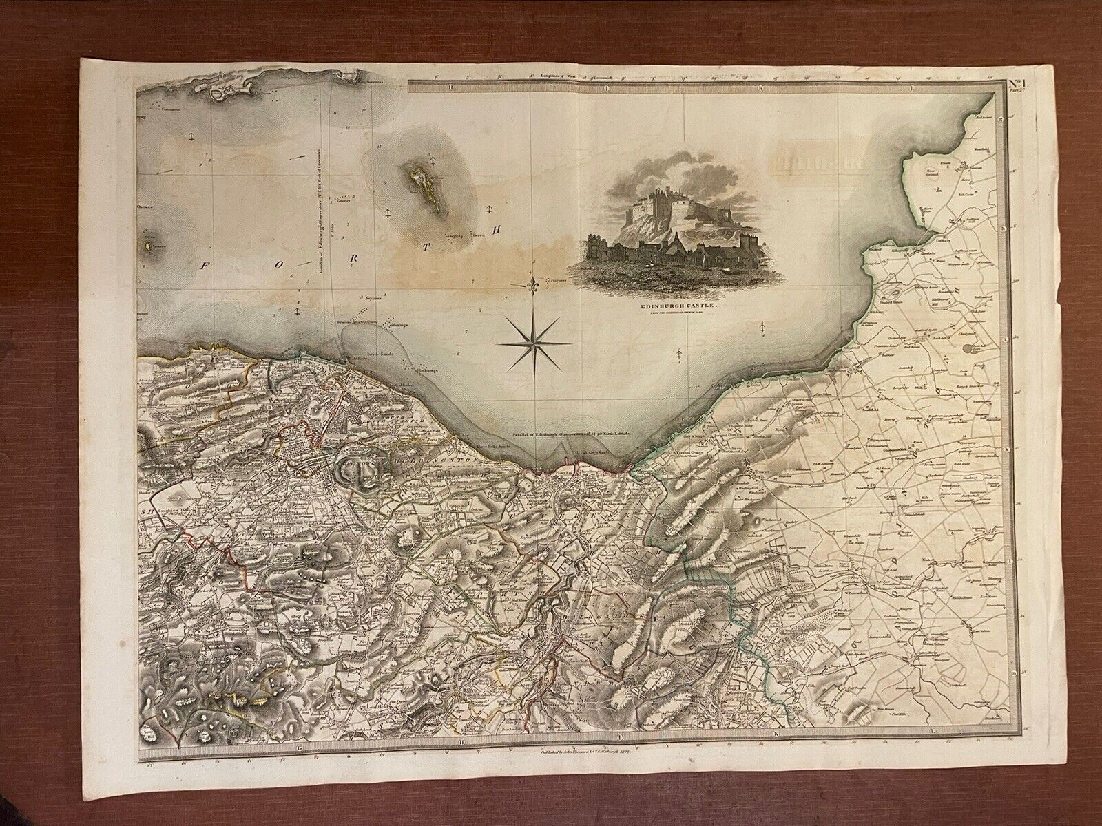 It is engraved and is hand-coloured in outline. Includes a vignette of Edinburgh Castle. The size of this map is 29 inches x 22 inches (735mm x 560mm)