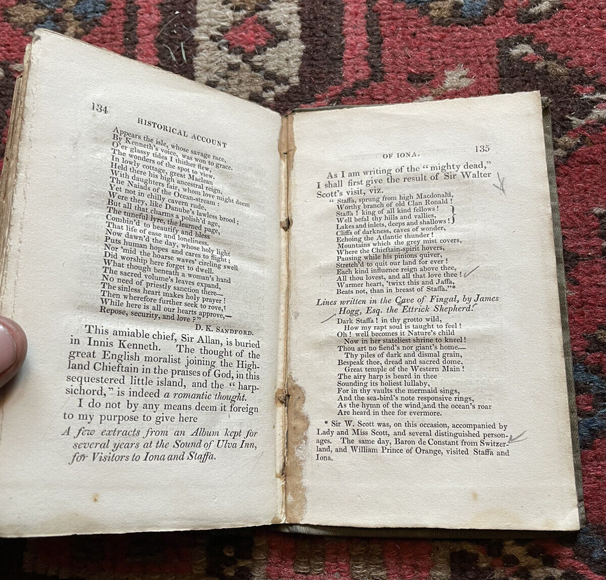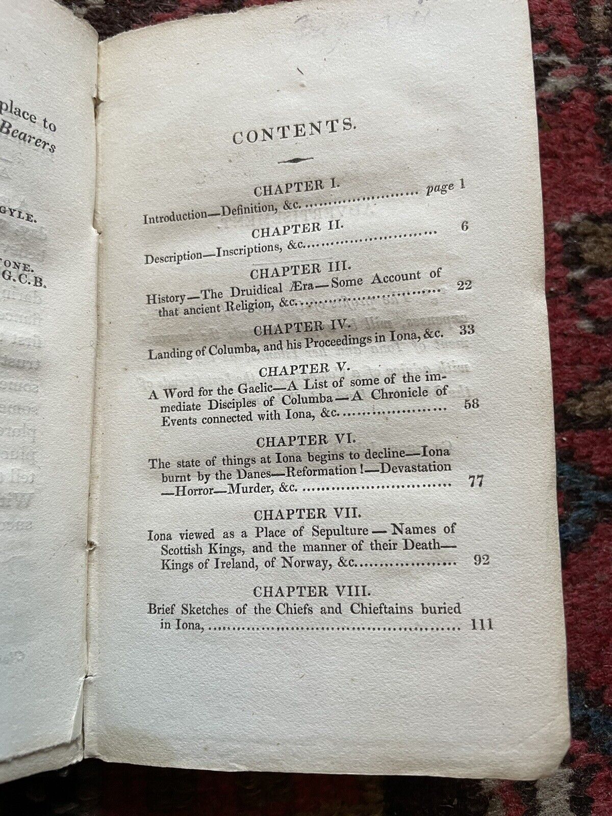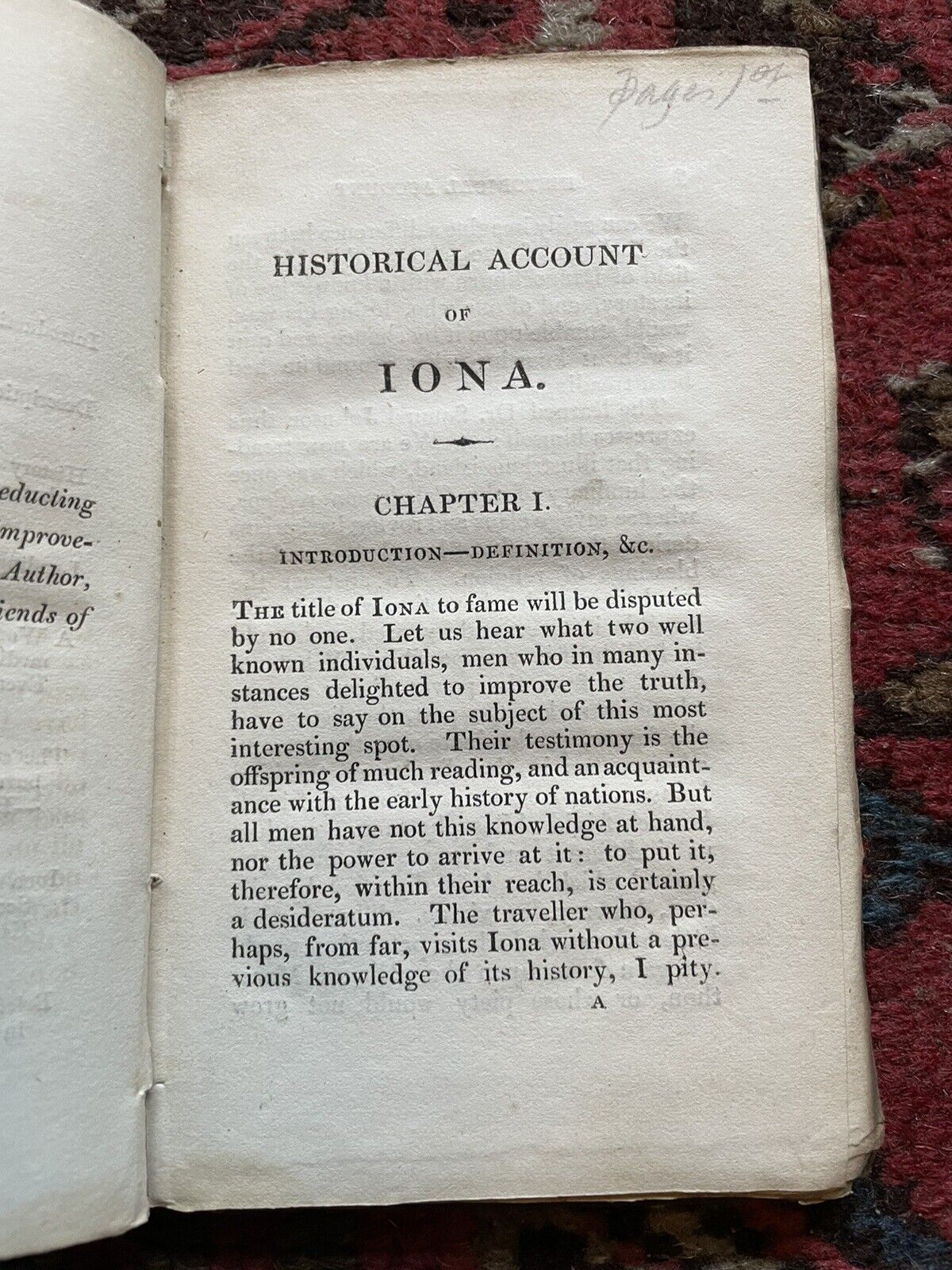 Published by Stirling and Kenney, Edinburgh, 1833. Second Edition. Small book measuring 16 x 9cm. Original cloth binding, 136 pages, with an engraved frontispiece showing Iona Abbey as it stood in 1833.
