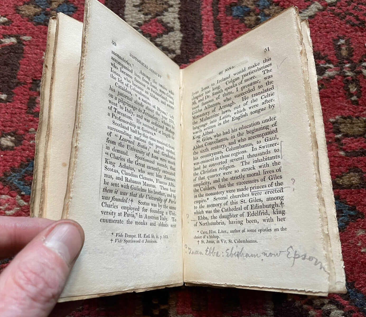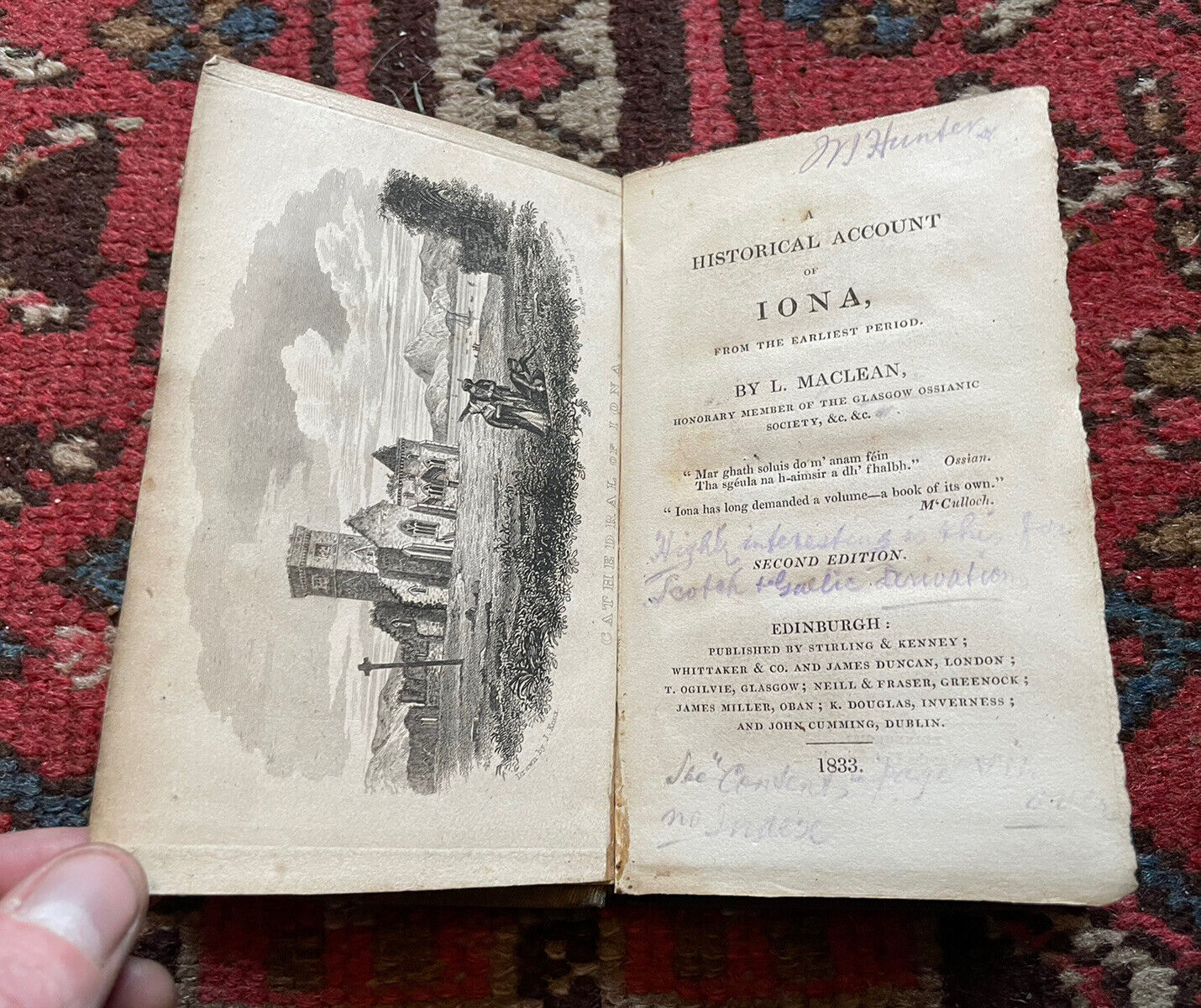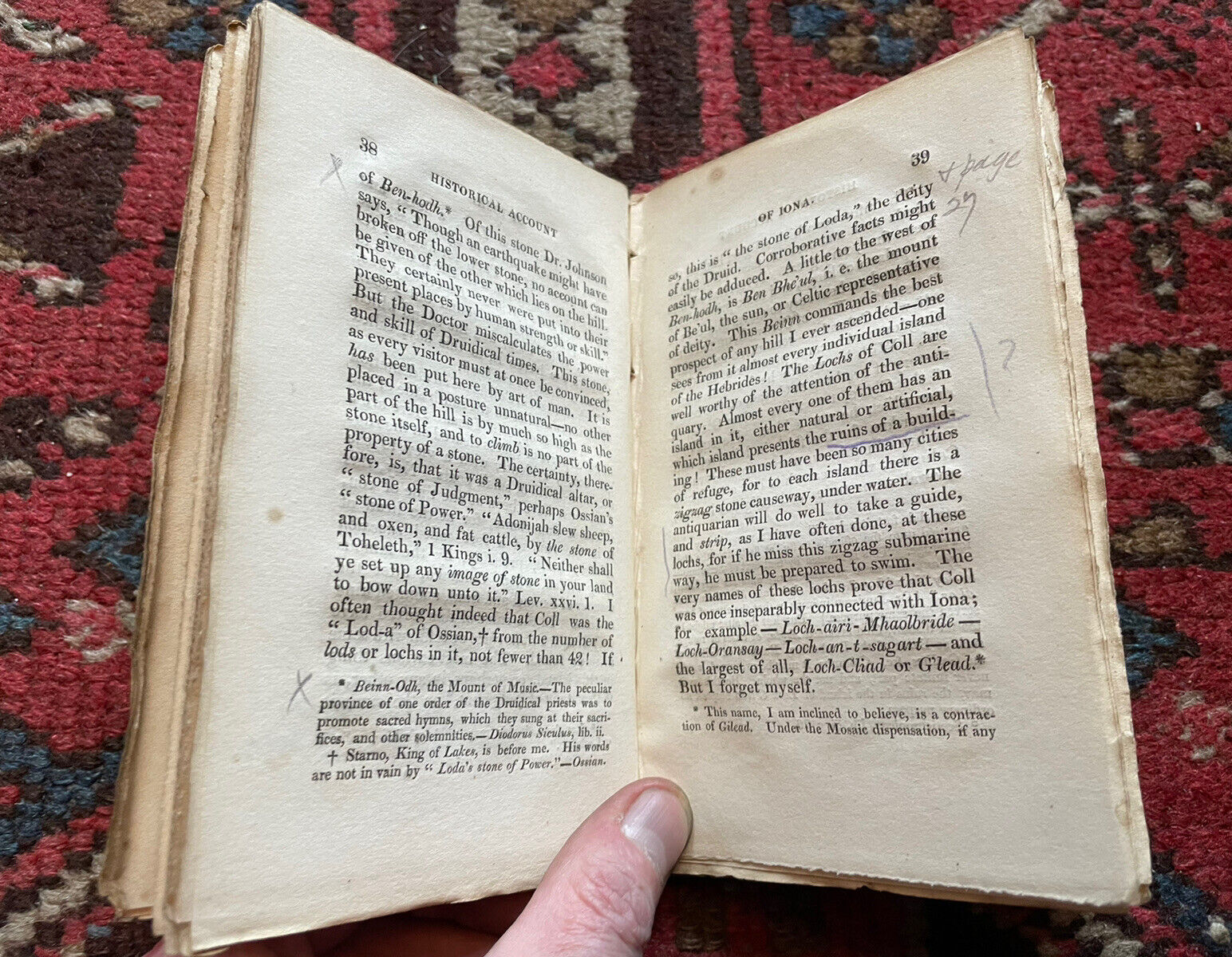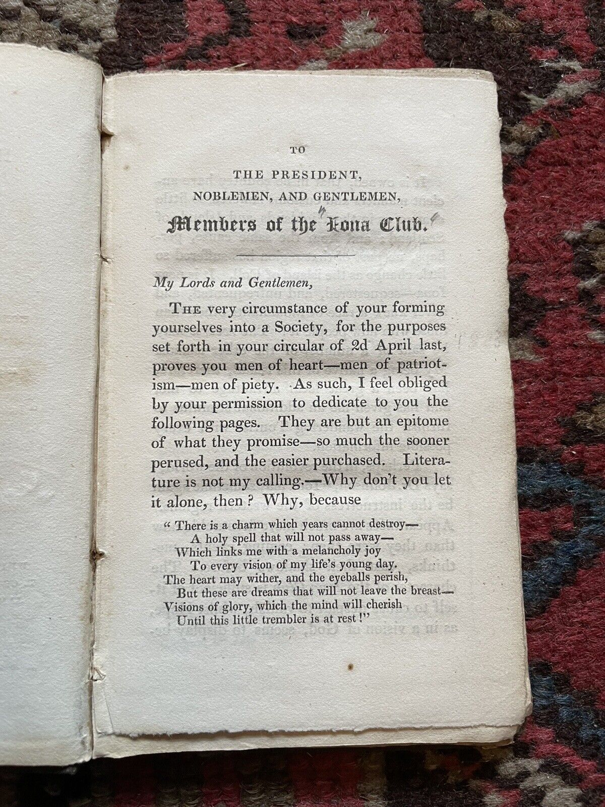 Published by Stirling and Kenney, Edinburgh, 1833. Second Edition. Small book measuring 16 x 9cm. Original cloth binding, 136 pages, with an engraved frontispiece showing Iona Abbey as it stood in 1833.