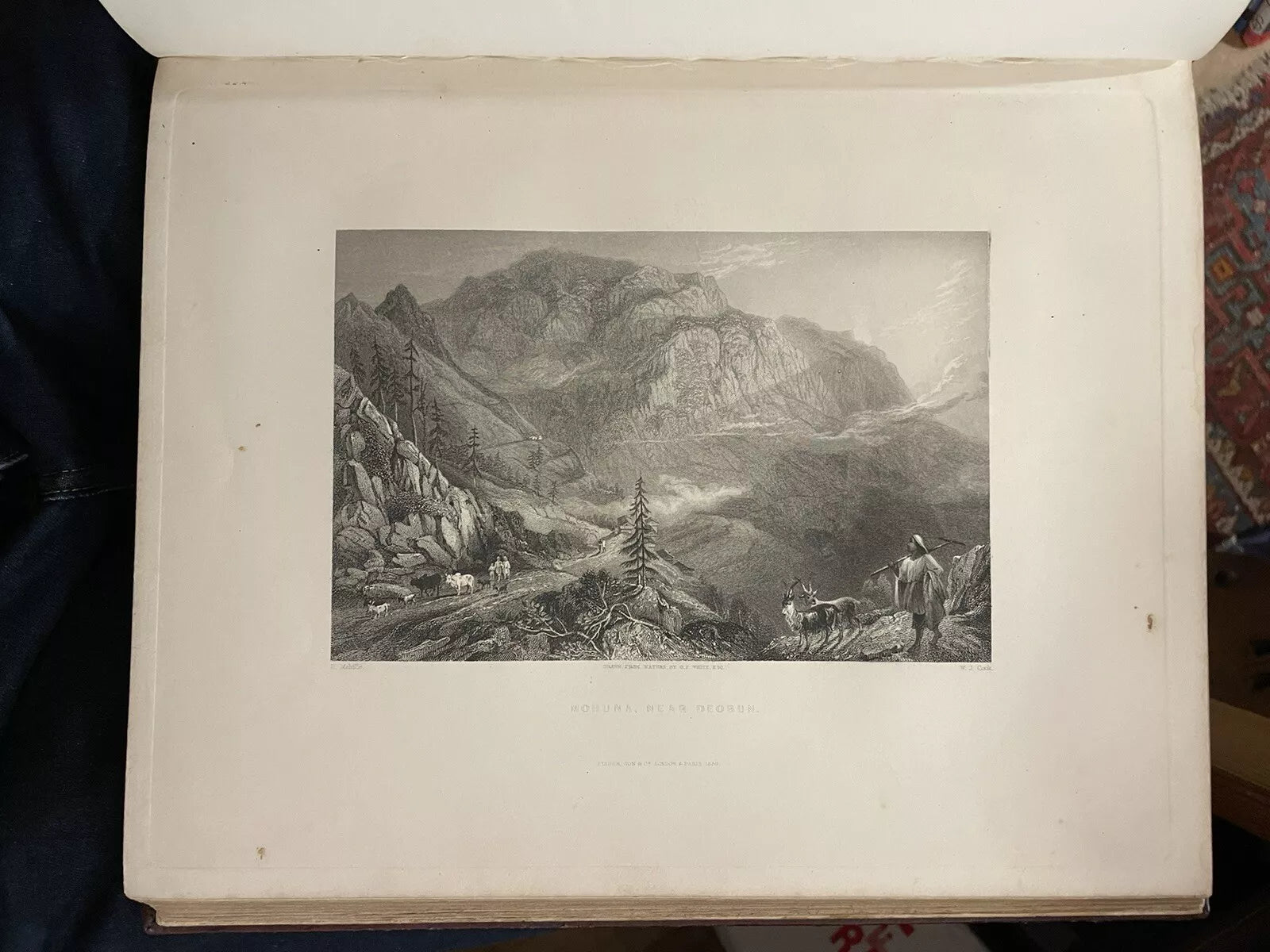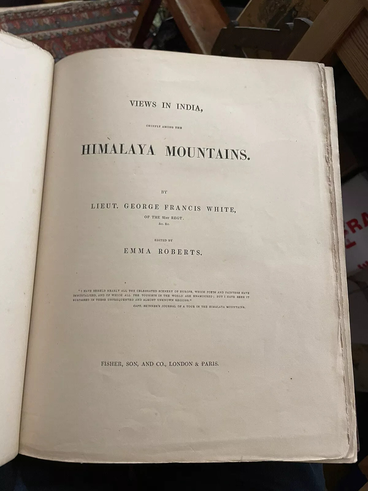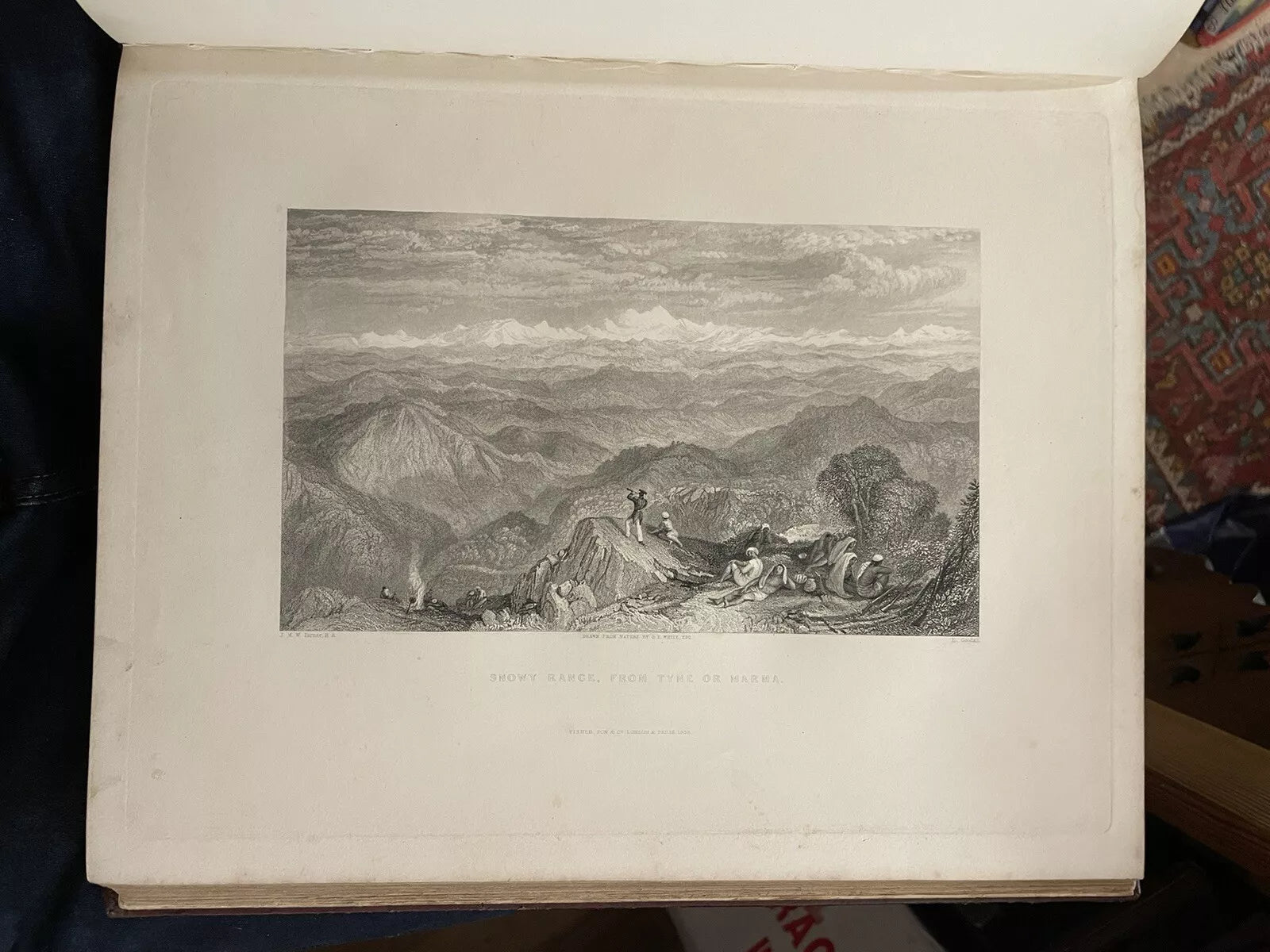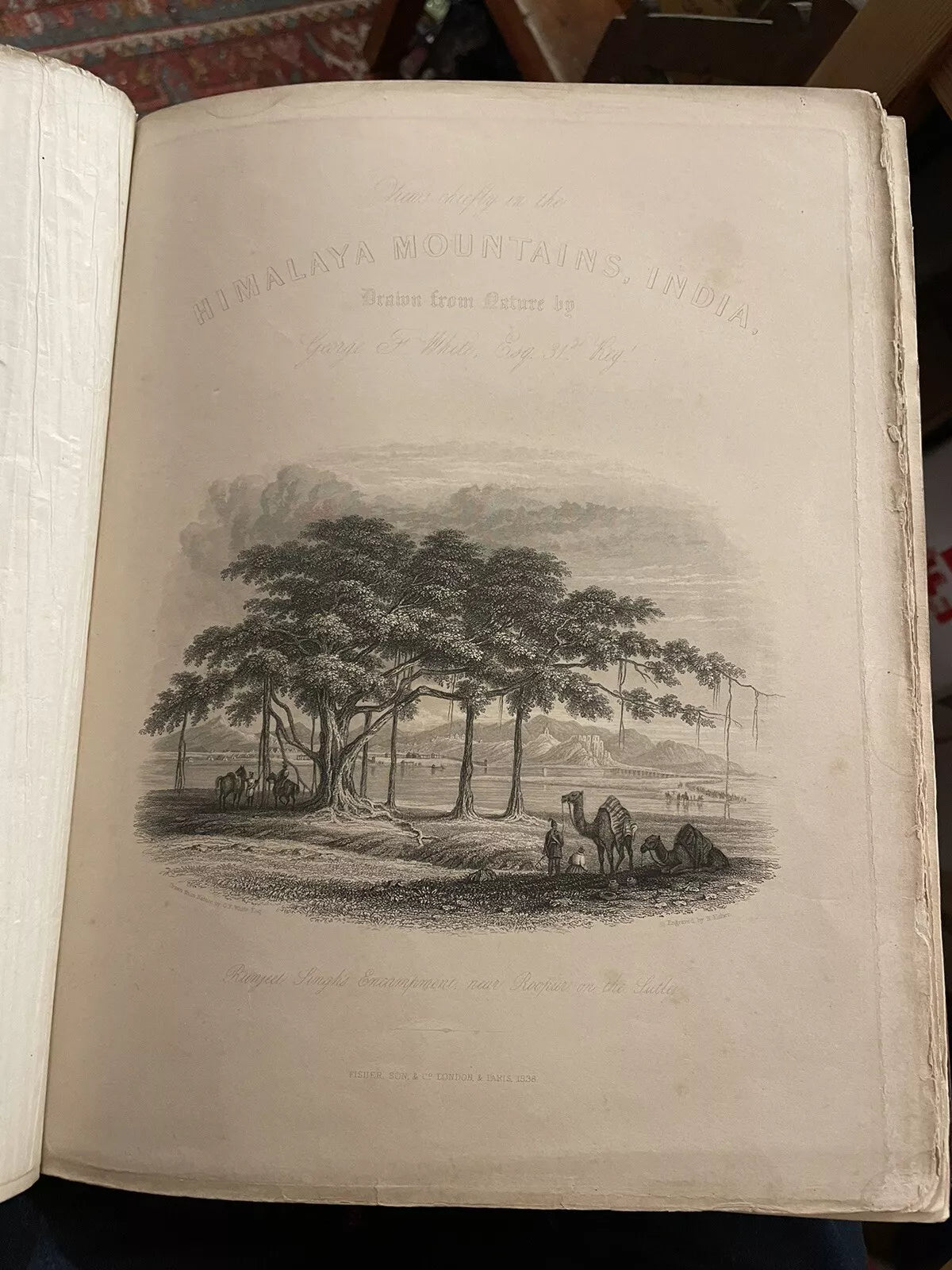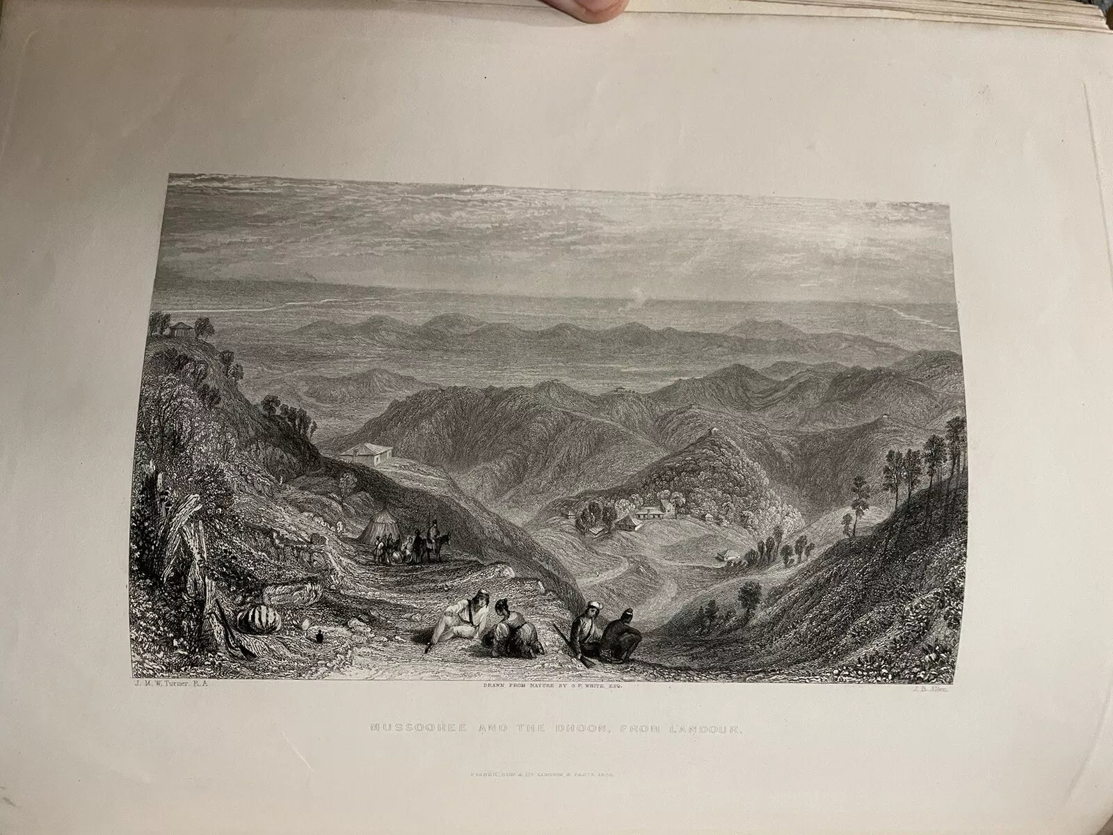 Lieut. George Francis White was a British officer serving in India and his views of the Himalayas, drawn by him on the spot, are the earliest taken of the Himalayas by a European. He explored the Mussoore, Simla, sources of the Jumna and Ganges in 1829-32. Includes two views of the Snowy Range of the Himalayas, showing distant views of Everest, and a view of a suttee.