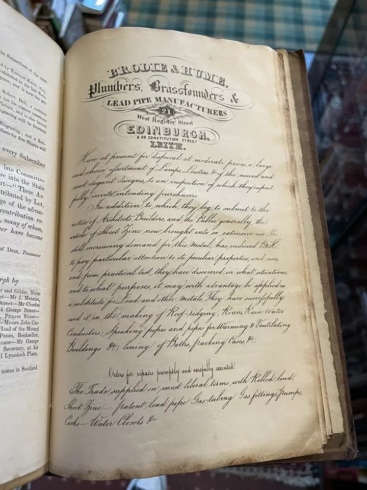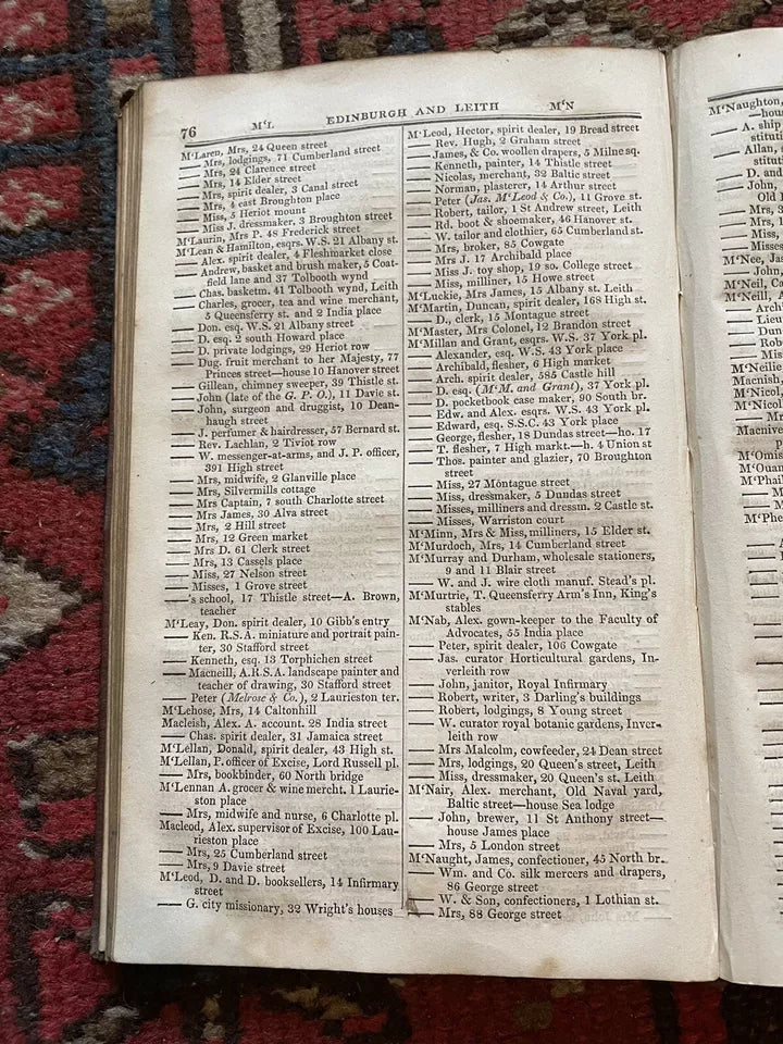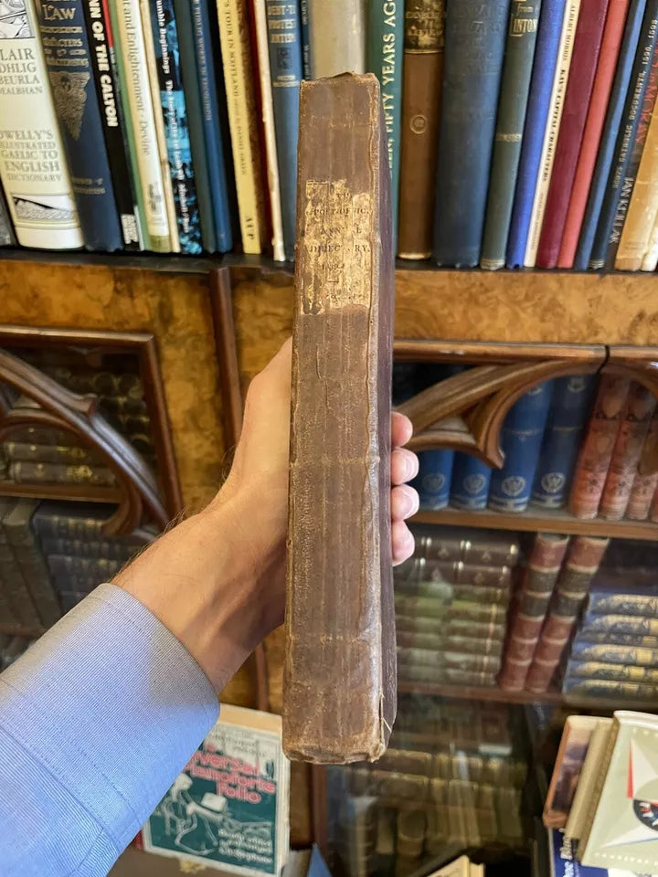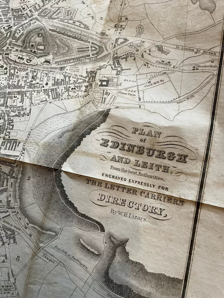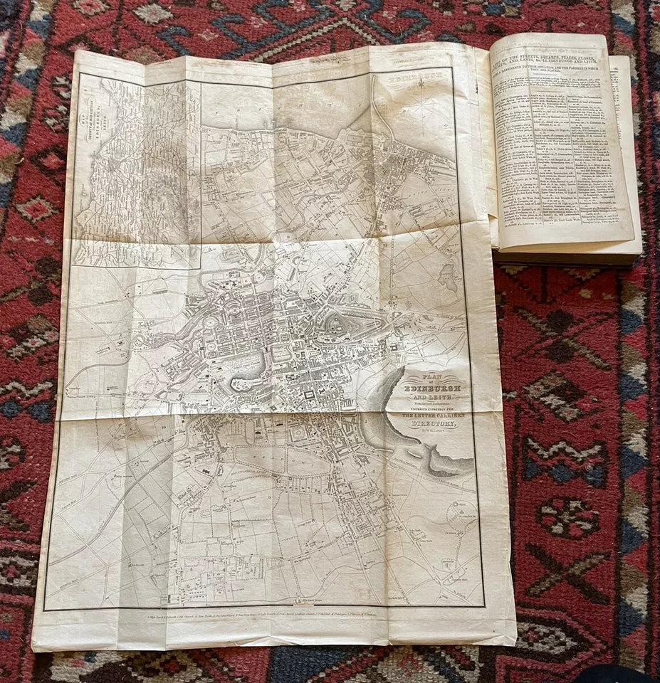A good copy. The original binding is good with some signs of age. Title label worn. Previous owner has written to the front board. Endpapers good. All contents present and pages good throughout. The large fold-out plan is in good condition with no tears. Overall a good copy of this early Edinburgh directory.