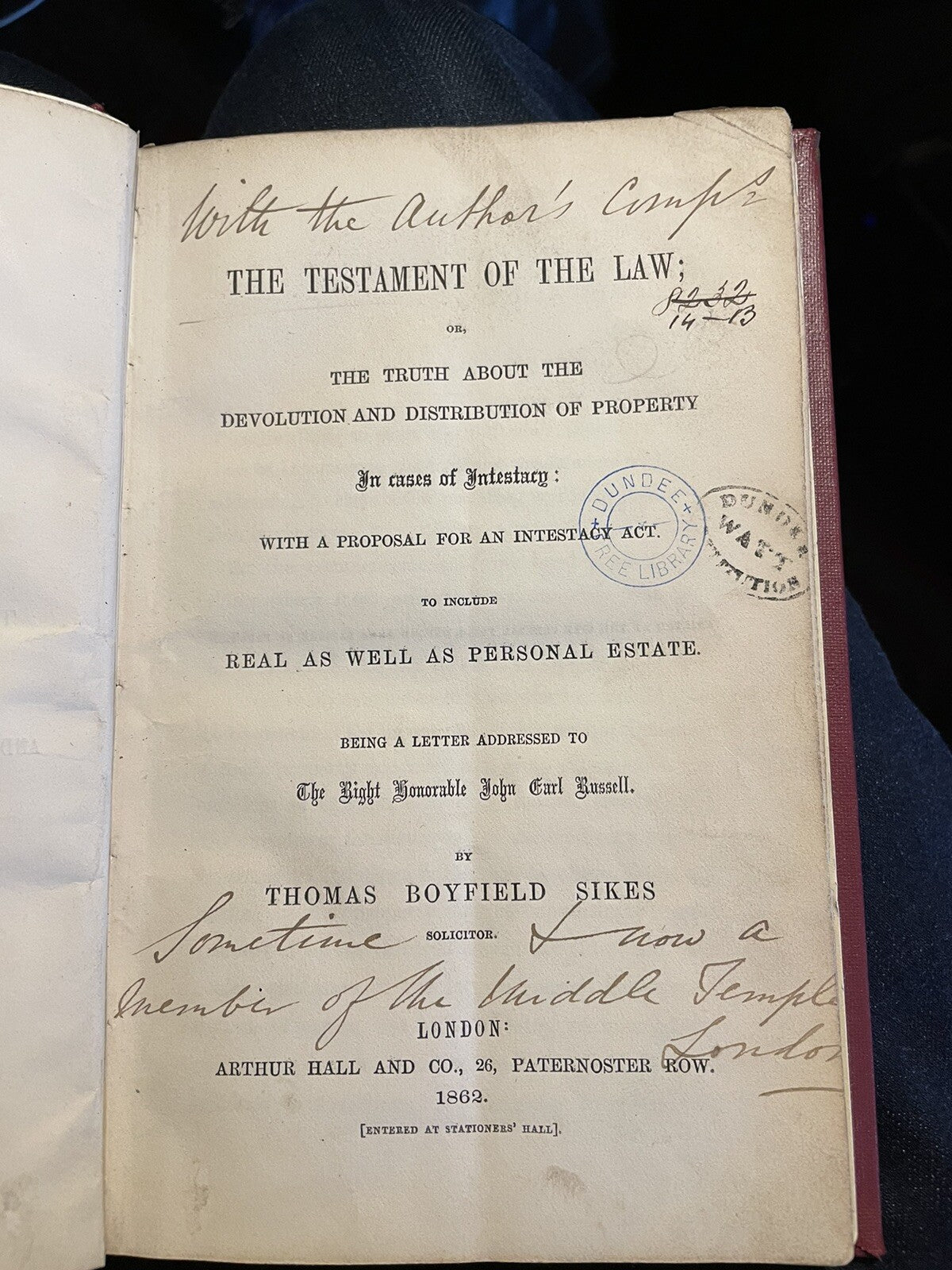 Inscibed by the author "With the author's compl . . Sometime [SOLICITOR] I'm now a member of the Middle Temple, London"