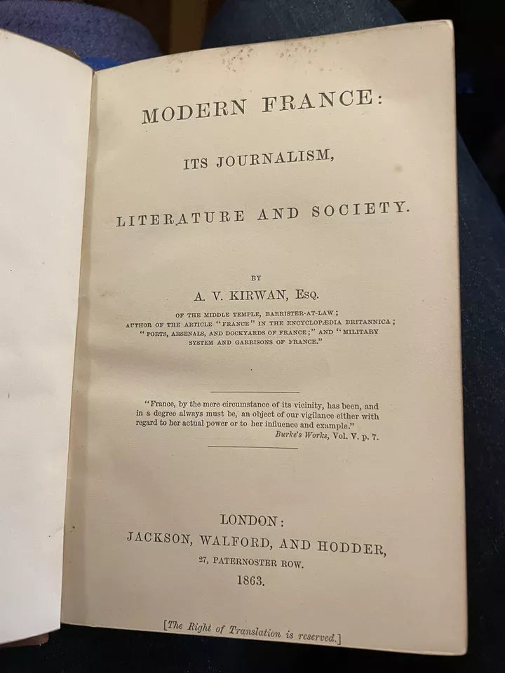 1863 Kirwan's Modern France, Its Journalism, Literature & Society : Full Leather
