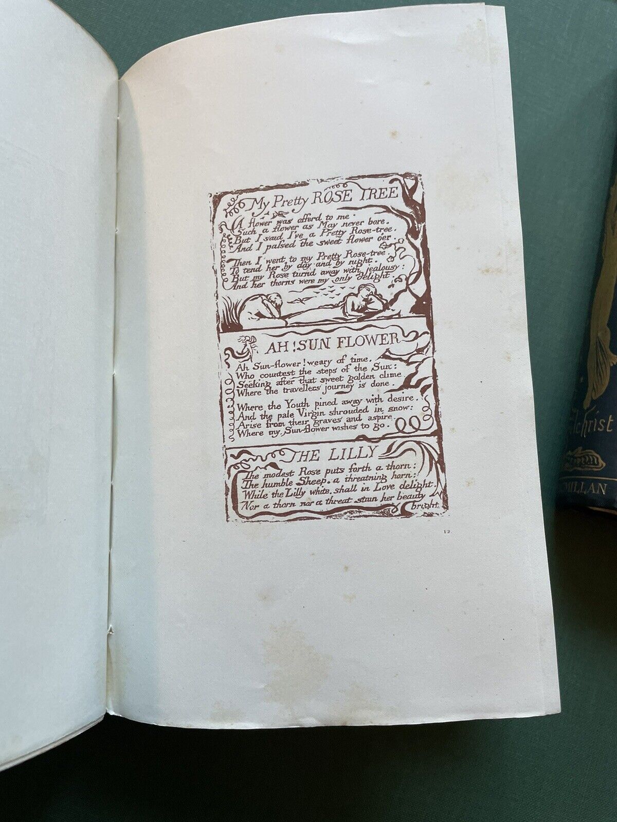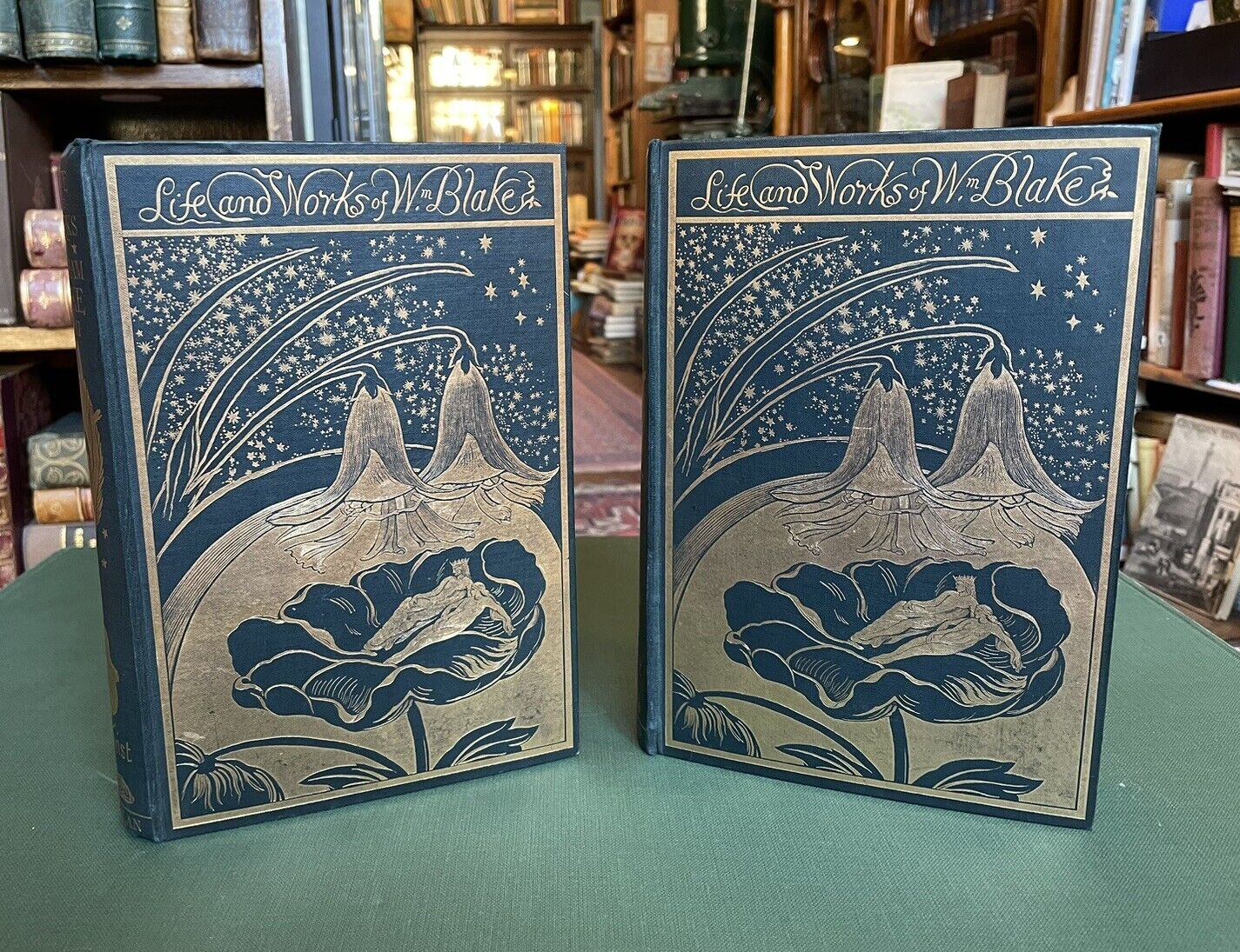 Macmillan and Co, London. 1880. The preferred second edition of Gilchrist's delightfully illustrated biography of William Blake, and in the original publisher's decorative cloth binding. Large 8vo (9.5" by 7"). xxi, 2-431; 383pp. Volume I illustrated with fifty-six vignette, full page and mounted illustrations, with volume II illustrated with forty-one full plates and vignettes, including a number of prints from electrotypes made from the original copperplates of 'Songs of Innocence and Songs of Experience', and Blake's Virgil woodcuts. Collated, complete and retaining the original half titles.