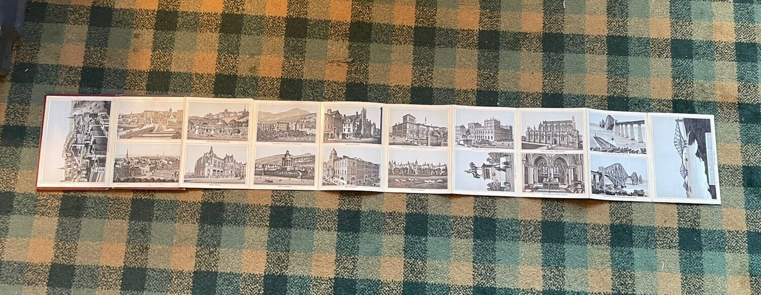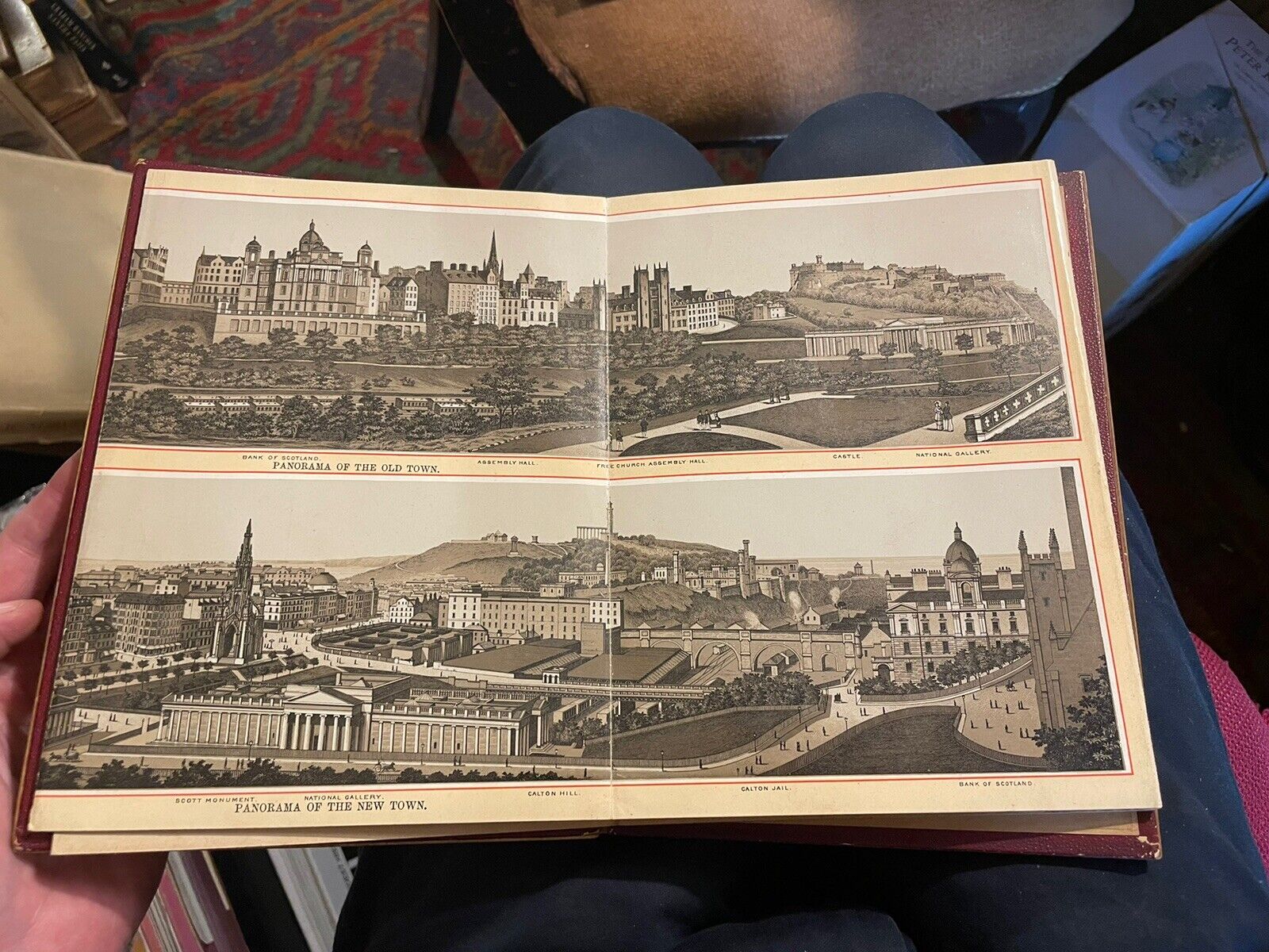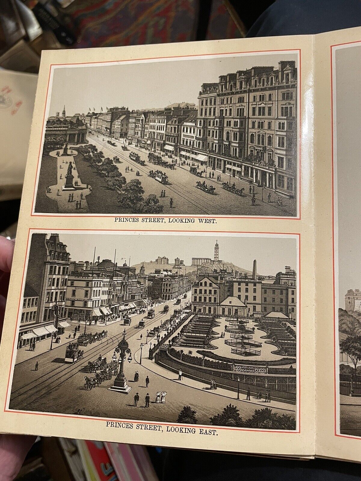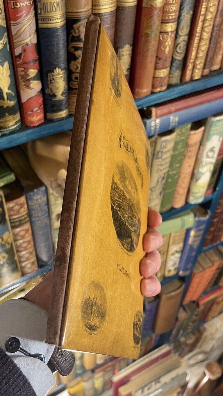 Here we have a lovely book dating from the 1890s with 18 wonderful views of the city of Edinburgh. Bound in wooden boards (Mauchline Ware) with cloth spine. The book measures 22.5 x 17cm. The front board has 5 images of Edinburgh, The Scott's Monument, Market Cross, Edinburgh from the Castle, Holyrood Palace and Edinburgh Castle. The rear board is plain. Large fold-out showing 18 wonderful photogravures. At the rear of the book there are 7 pages of text giving an historical sketch of Edinburgh.