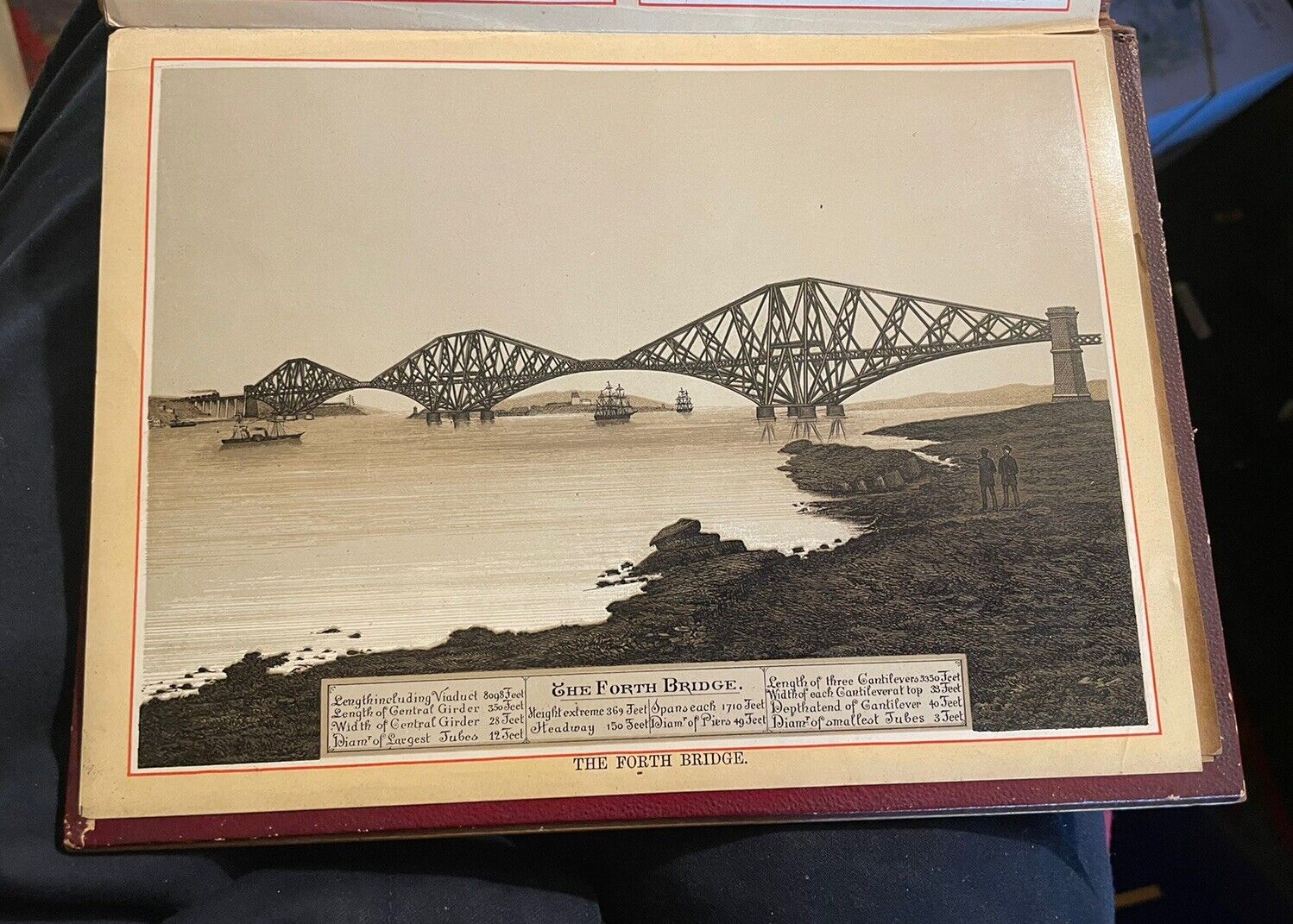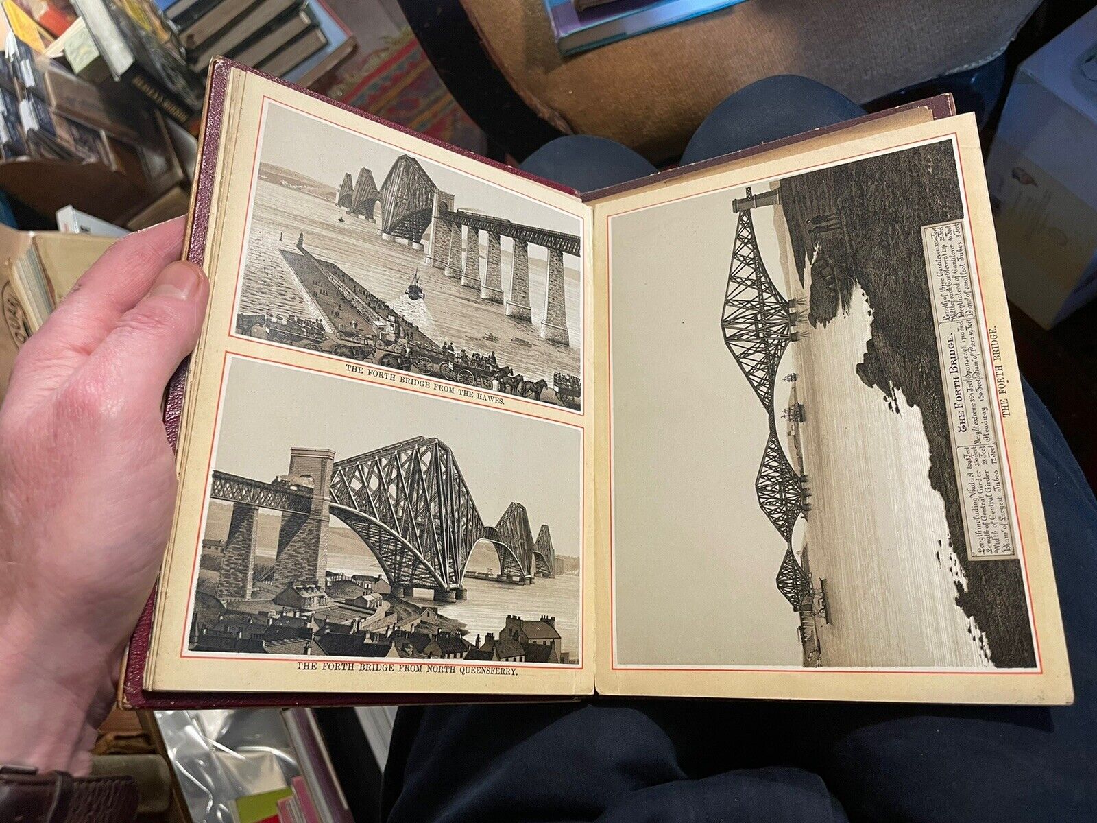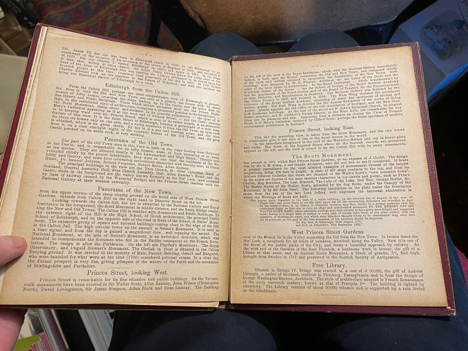 Here we have a lovely book dating from the 1890s with 18 wonderful views of the city of Edinburgh. Bound in wooden boards (Mauchline Ware) with cloth spine. The book measures 22.5 x 17cm. The front board has 5 images of Edinburgh, The Scott's Monument, Market Cross, Edinburgh from the Castle, Holyrood Palace and Edinburgh Castle. The rear board is plain. Large fold-out showing 18 wonderful photogravures. At the rear of the book there are 7 pages of text giving an historical sketch of Edinburgh.