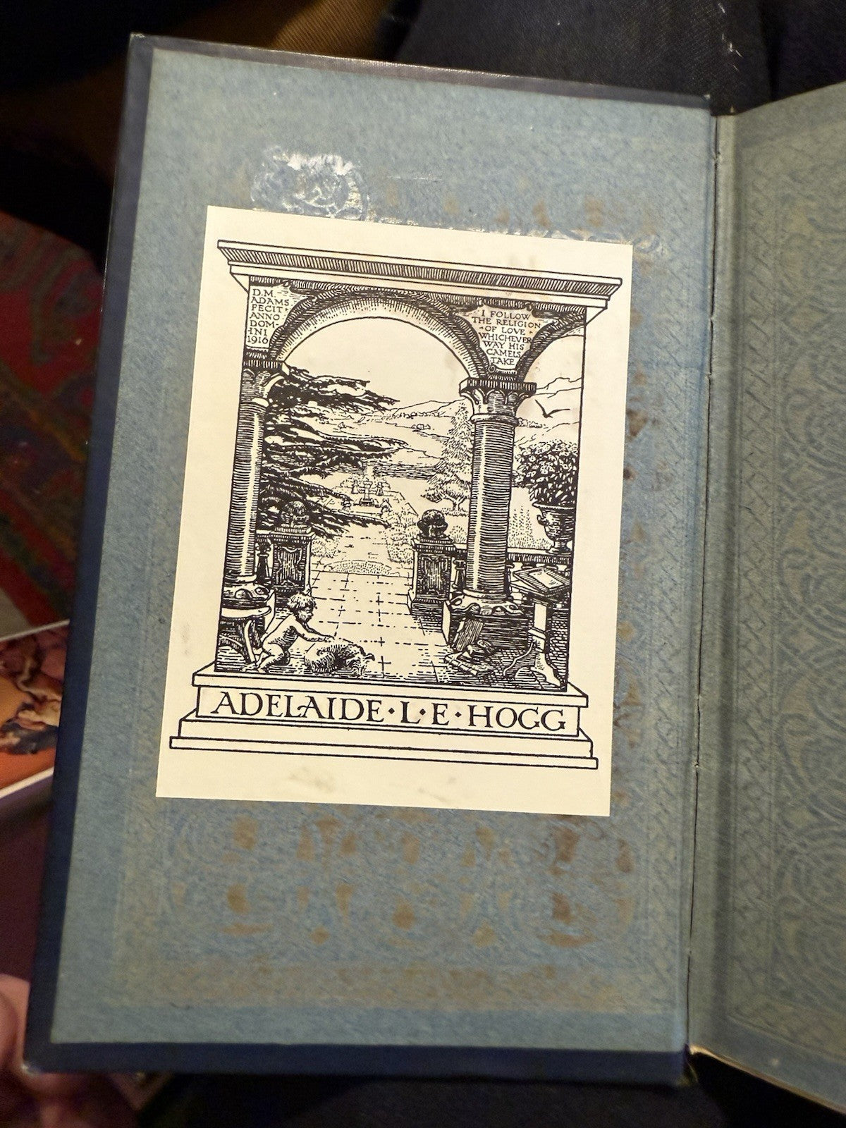 A good copy. The cloth binding is good with alittle wear to teh cloth at the foot of the front hinge (see image). Patterned endpapers very good. Bookplate belonging to Adelaide L. E. Hogg pasted to inside front board. All contents present and pages clean throughout. Overall a good copy.