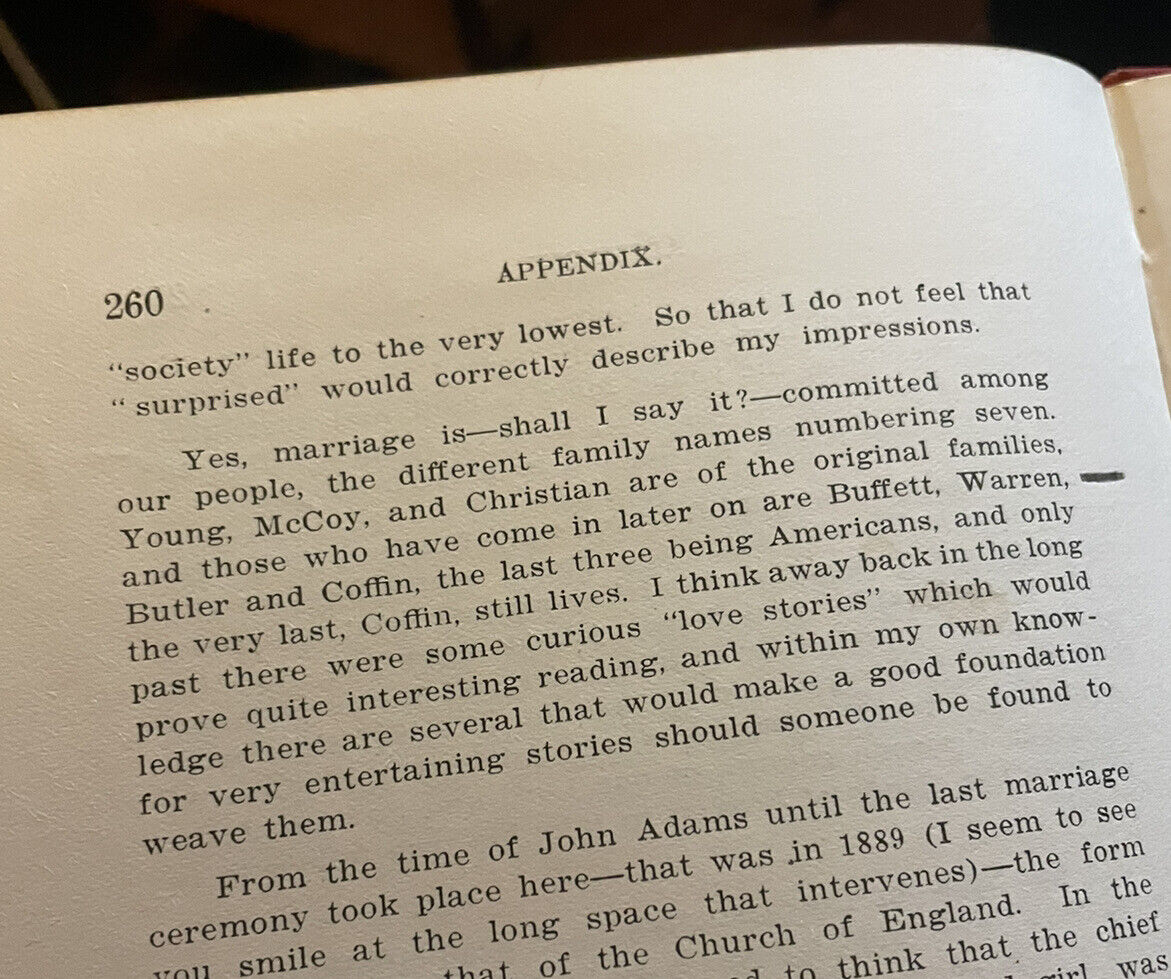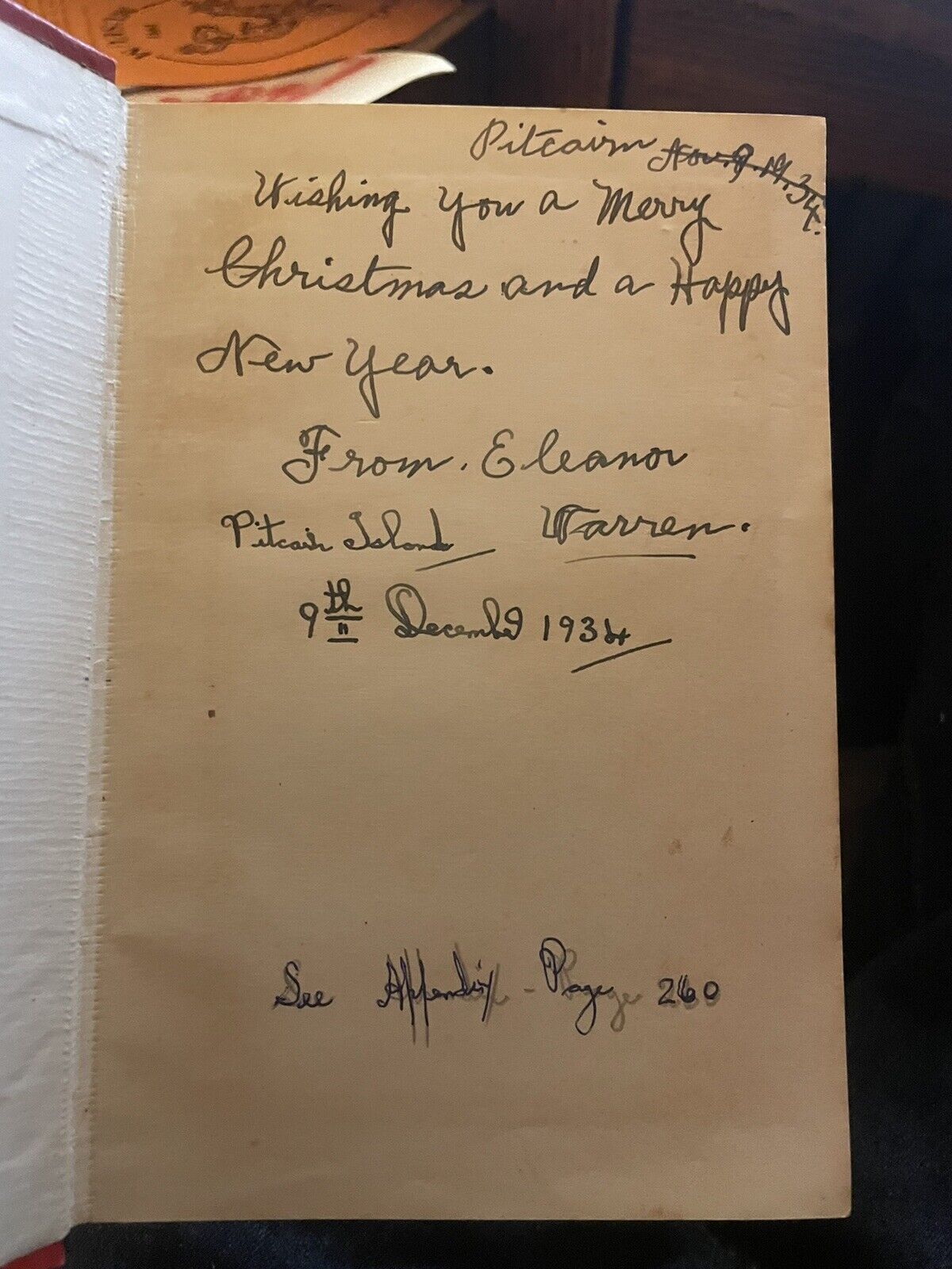 This book has an interesting inscription on the front endpaper revealing that the book was gifted to somebody for xmas in 1934 from an Eleanor Warren who was also a daughter of Pitcairn Island . . below her inscription somebody has writen a note pointing the reader to page 260 of the Appendix where they will find the family name, Warren (see last two photo provided above).