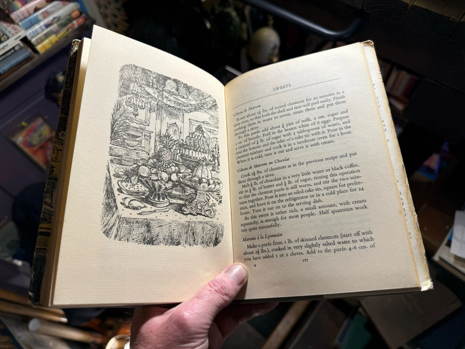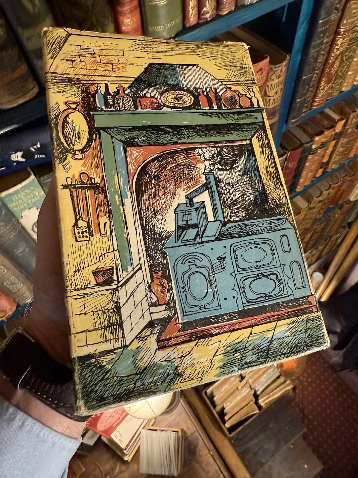 Published by Macdonald & Co, London, 1958. Includes beautifully decorated dust jacket designed by John Minton. Hardback 8vo cloth bound book with gilt lettering to spine. Lovely illustrated frontispiece. pp x, 207 pages in total with an extra page of advertisements containing David's other cookery books.