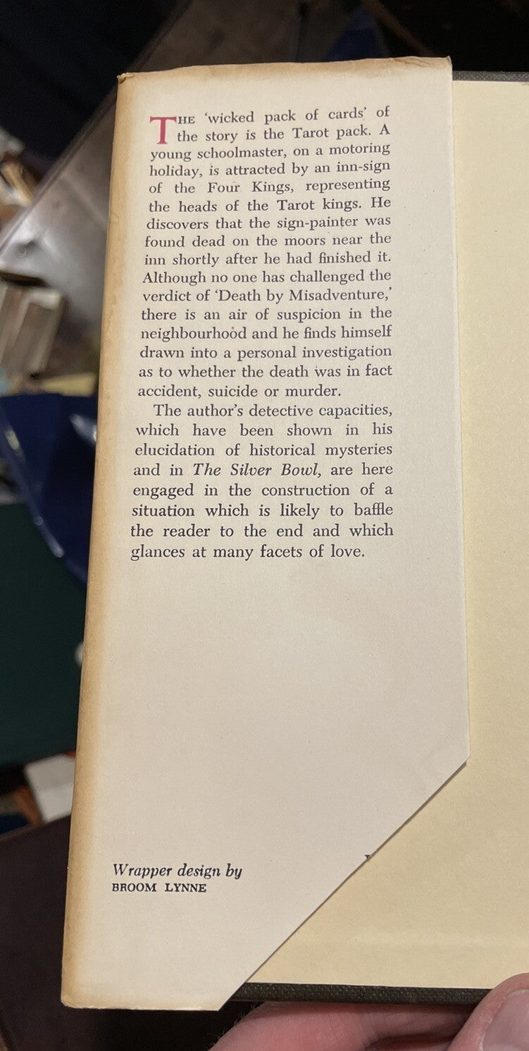 A young schoolmaster on a motoring holiday is attracted by an inn sign of the four kings representing the heads of the Tarot Kings. He discovers the man who painted the sign was found dead shortly afterwards and he finds himself drawn into a personal investigation to whether the death was accidently suicide or murder..