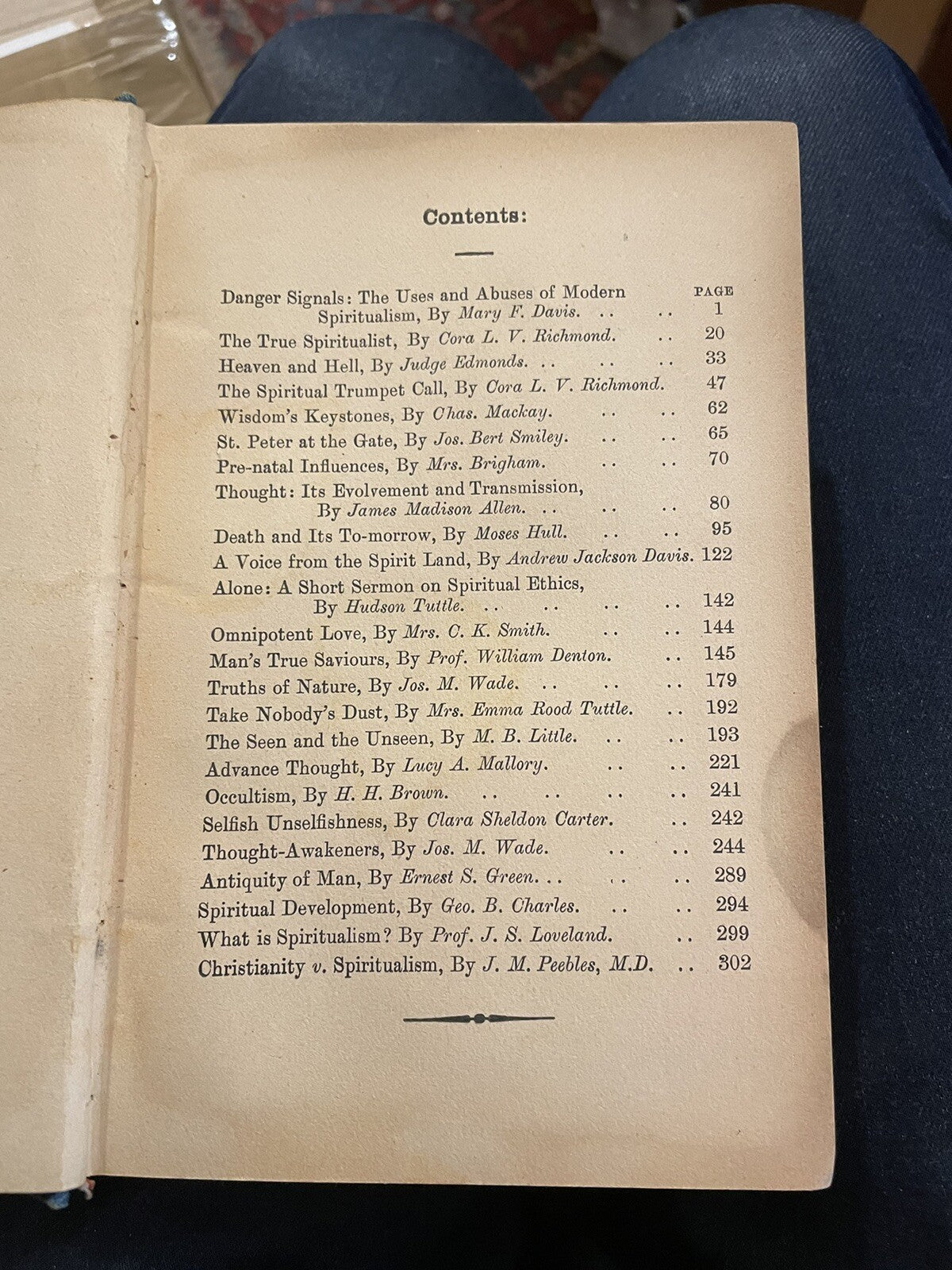 Contributions by: Mary F. Davis, Cara L V Richmond, Judge Edmonds, Chas Mackay, Jos. Bert Smiley, Moses Hull, Prof. William Denton, Lucy A Malory, Jos. M Wade, Ernest S Green, Geo, B Charles, J S Loveland, J M Peebles, . . and others (See contents page in images provided)