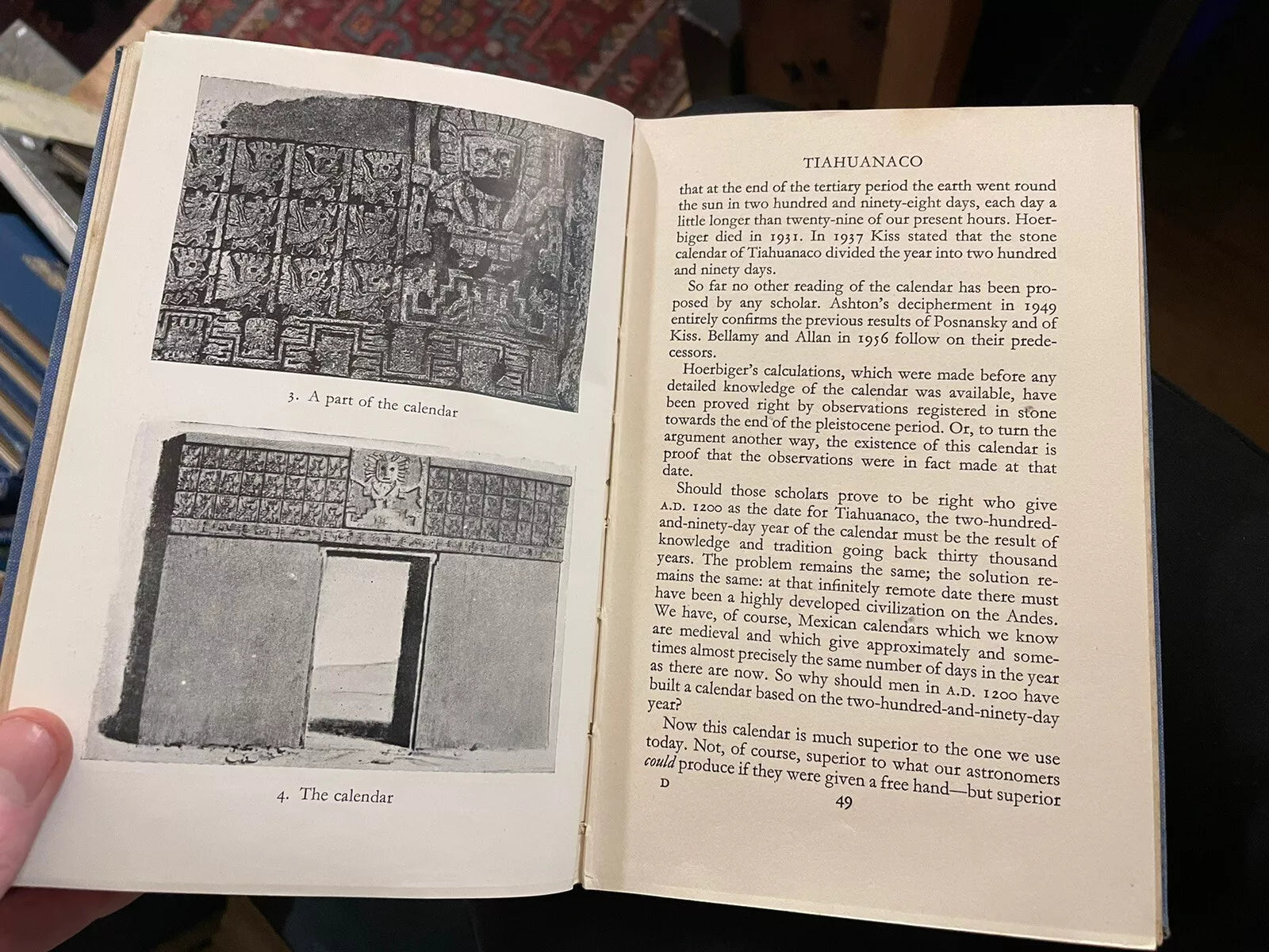Atlantis and the Giants centers on the reign of the Giants, which Saurat takes to be the older and more powerful race of humans who preceded us. They lived on the standard lost continents like Atlantis and Mu, and the previous ice-covered moon that once orbited the Earth was responsible for destroying their civilization when it crashed into the Earth. This (but of course) was remembered only in myth and legend, and preserved, as the author notes, in Genesis 6:4, the famous passage about the Nephilim, who were destroyed in the Flood. Saurat places a great deal of weight on Tiwanaku because he takes the eight-foot tall stone idols there to be life-size representations of the Giants, and he repeats the standard fringe history claims about how the large stones used to build it and nearby Puma Punku could have been moved, though he answer the question with “Giants” rather than “aliens.” Like other fringe figures, he agrees that Tiwanaku was once a coastal capital. You see, one of the ice-moons was once quite close to the Earth, and its gravity lifted the tides up to 13,000 feet, until the ice-moon fell apart and left Atlantis (Tiwanaku) stranded.