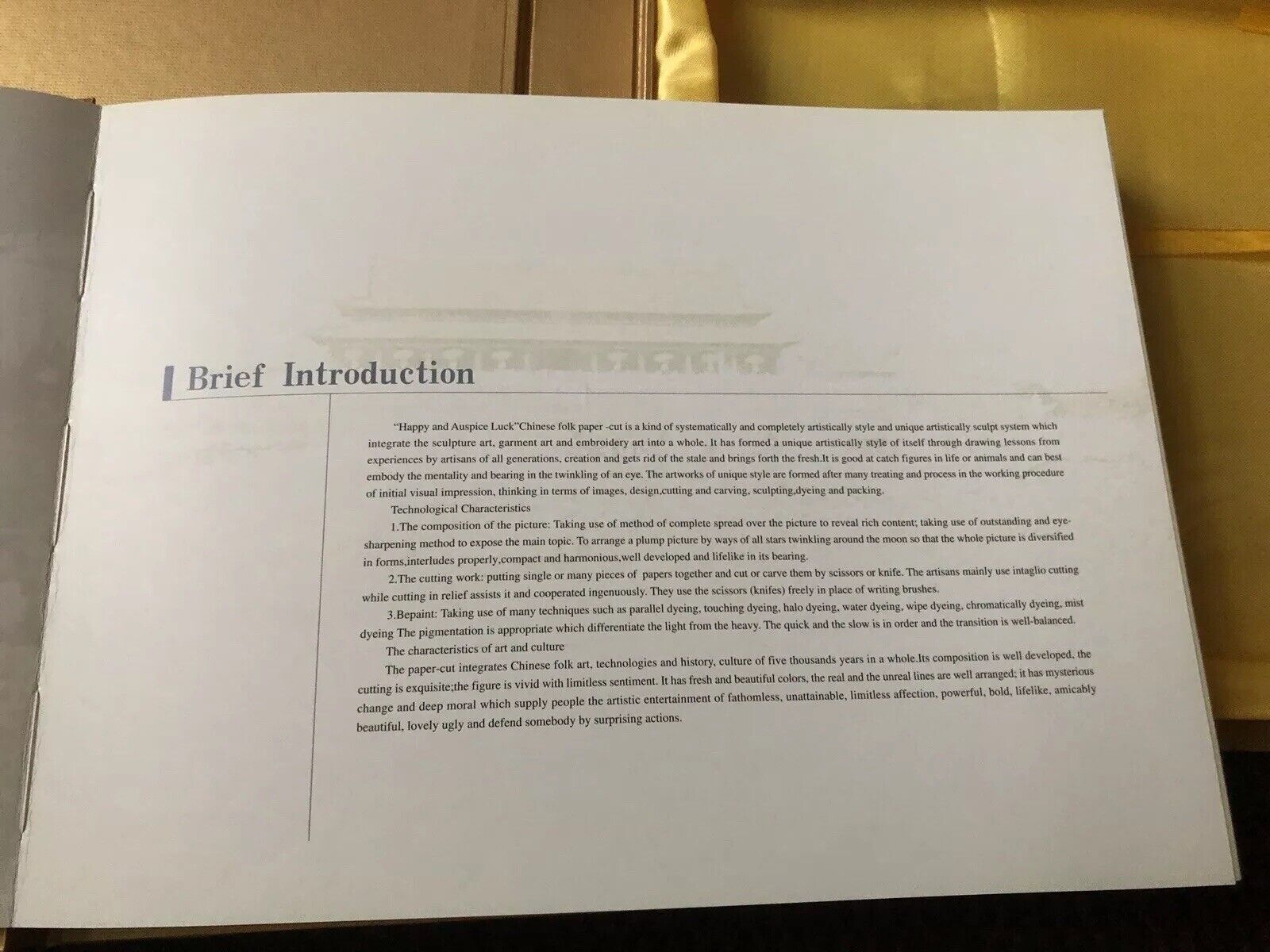 The book is an oblong hardback measuring approx 28 x 21cm and is housed in a specially made box with yellow silk lining and silk lifting ribbon. The book is unpaginated but there are approx 70 pages. Each page has a couple of Chinese figures cut beautifully from paper and placed loosely under a plastic leaf. The plastic leaves can be lifted to examine the paper-cuts more closely if needed. The cut-outs are each accompanied by text in Chinese and English.