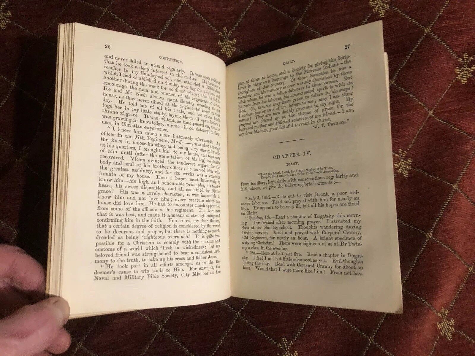 In 1852 he became adjutant of his regiment. In May 1853 the regiment returned to England, and in August he resigned the adjutancy. He also became a frequent attendant of meetings held at Exeter Hall and an active member of the Soldiers' Friendly Society, besides holding meetings with railway navvies on many occasions.