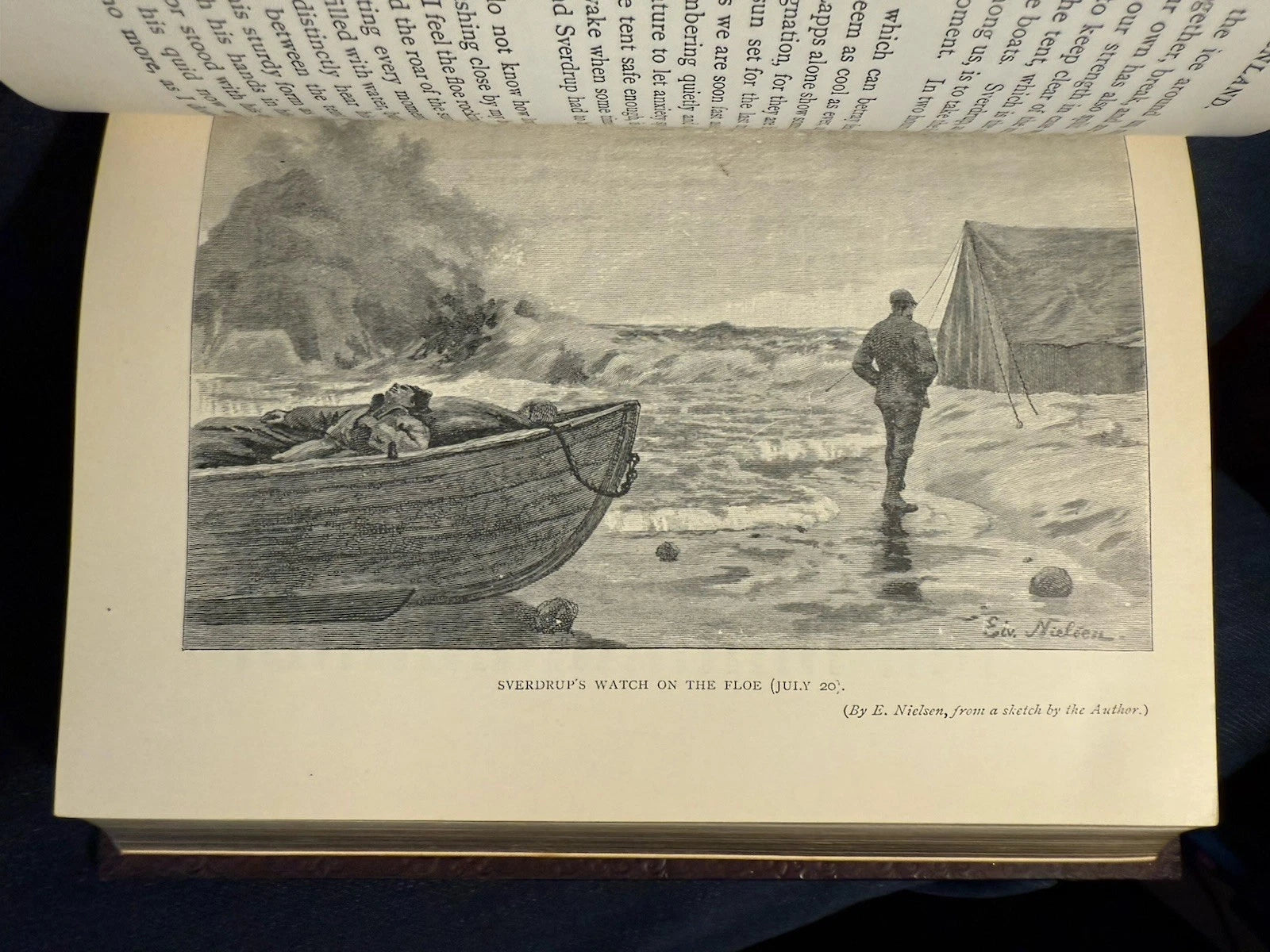 London: Longmans, Green, and Co., 1910. Colonial Edition, New Impression. Printed by Ballantyne, Hanson & Co. Fine binding, hardcover, octavo (18.5 x 12 x 3 cm), pp. xii, 452. English text. Finely bound in full calf gilt, cross-hatching to panels, all page edges gilt, marbled endpapers, portrait frontispiece with tissue guard, with numerous illustrations and a map of Southern Greenland, rear index in double columns.