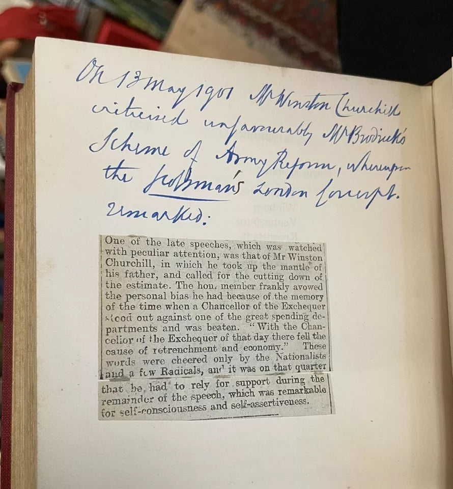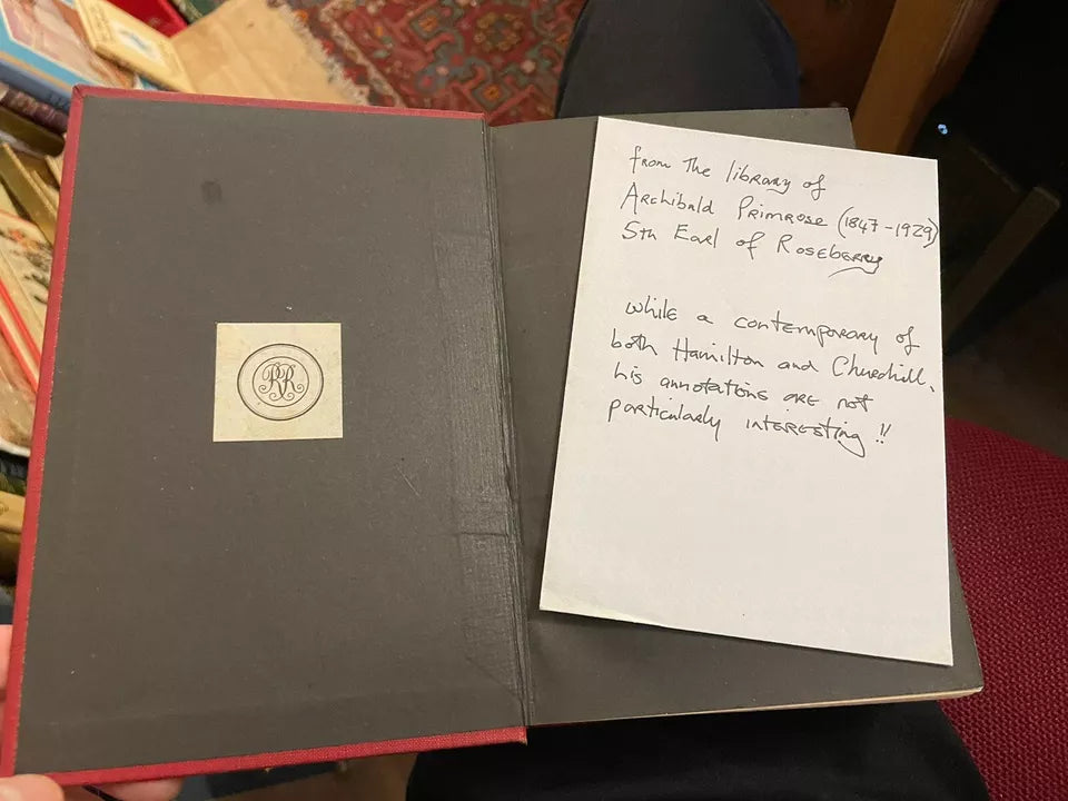 This copy comes with a note inside stating that this book came from the library of Archibald Primrose (1847-1929) 5th Earl of Roseberry, and further states that "while a contemporary of both Hamilton and Churchill his annotations are not particulary interesting"