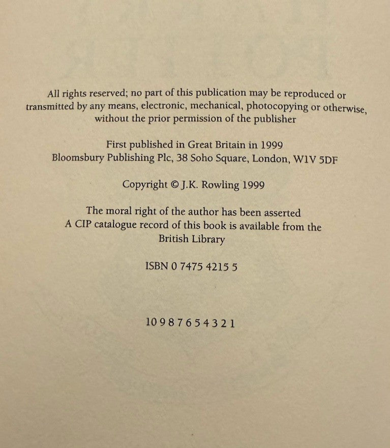 Published by Bloomsbury, London, 1999. First Edition with numberline 10 9 8 7 6 5 4 3 2 1. Third state (“J.K. Rowling” with omitted printer on imprint page and corrected text on page 7, plus 2 pages of adverts at the rear).