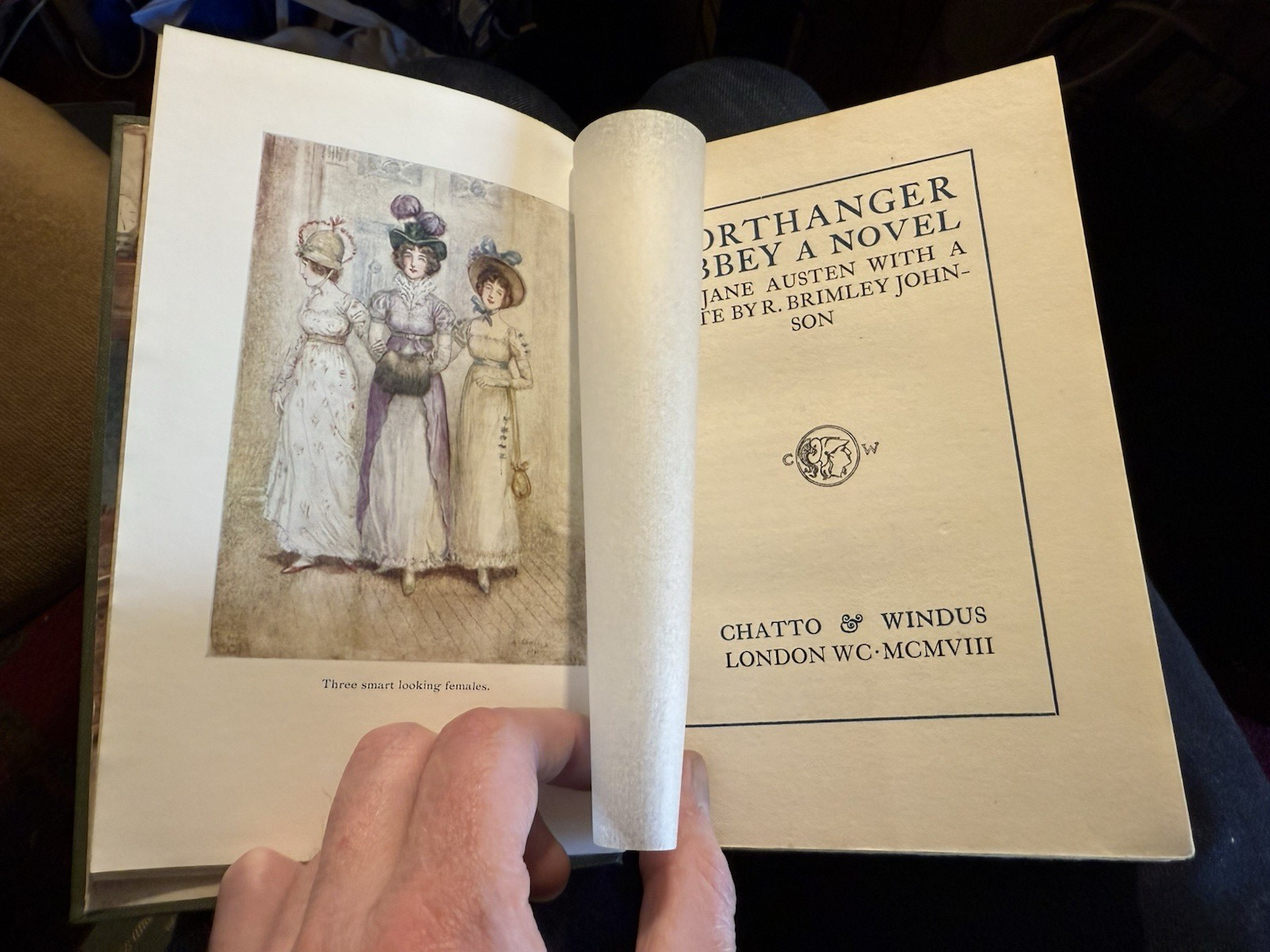 Published by Chatto & Windus, London, 1908. From The Novels of Jane Austen. Complete in One Volume. Hardback book, 8vo, cloth binding with gilt titles and vignette to upper board. Colour illustrated endpapers. 308 pages. 10 colour plates by A. Wallis Martin.