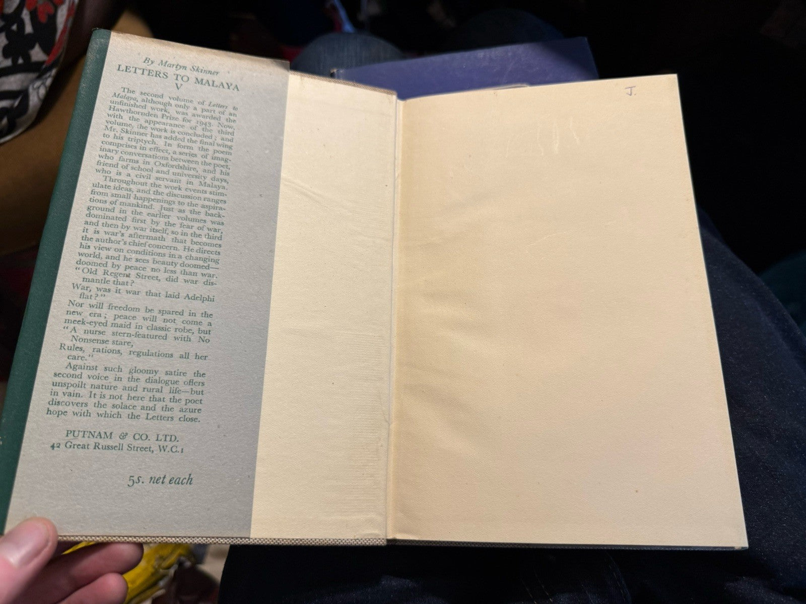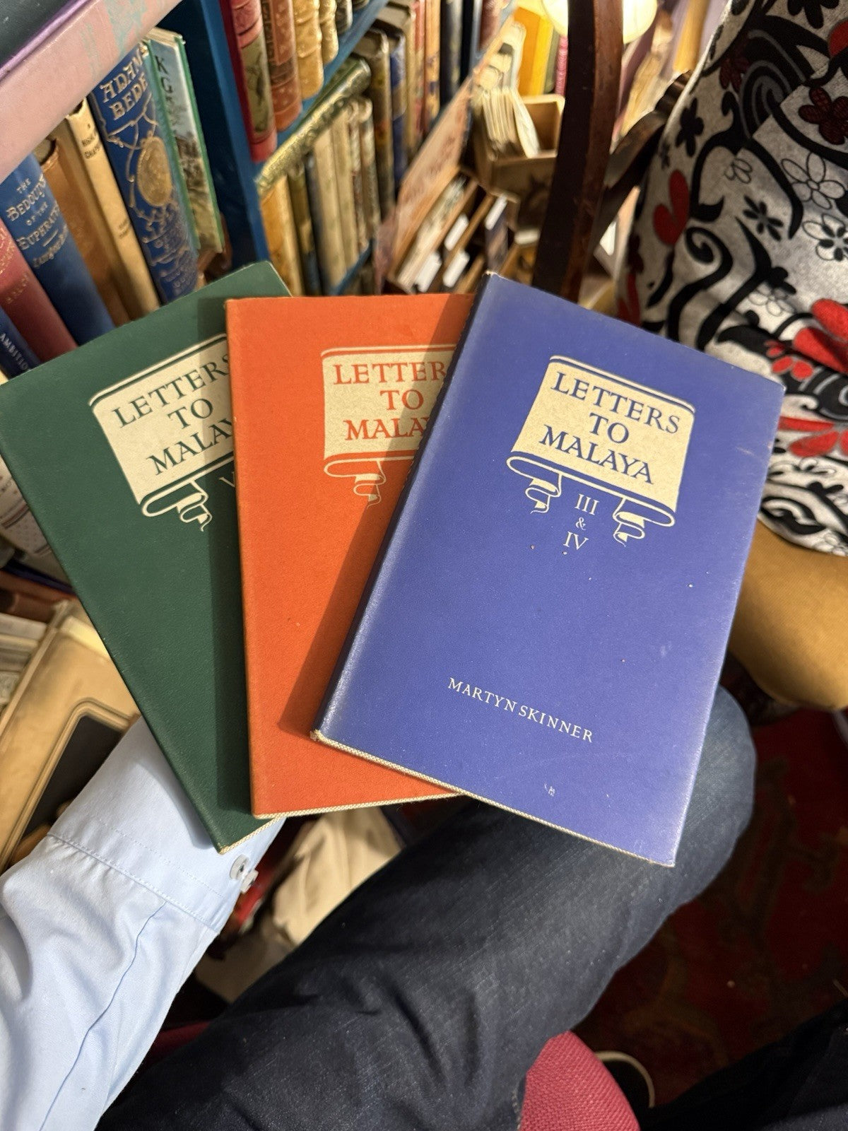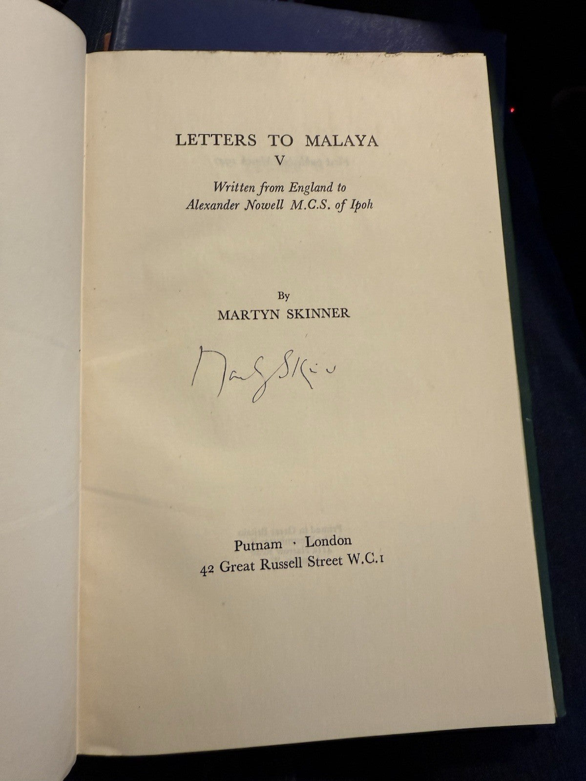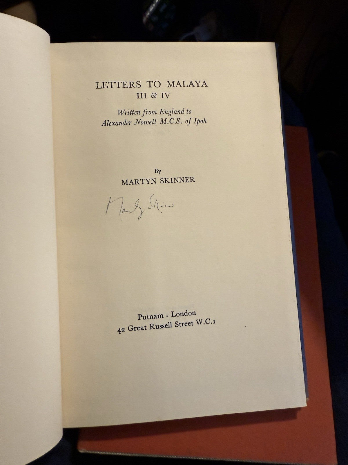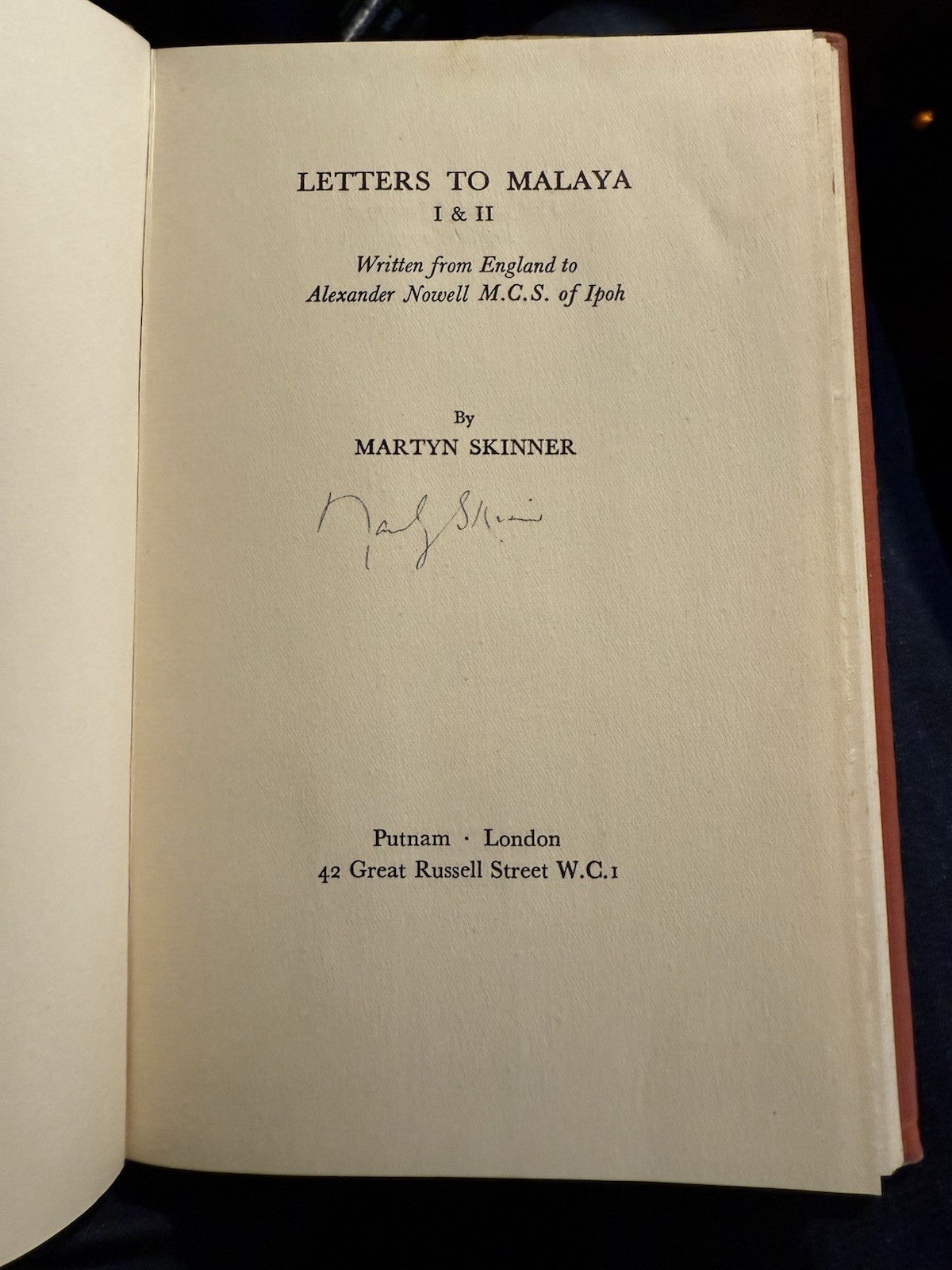 For sale we have three volumes of Letters to Malaya containing five letters. All are hardbacks in dust jackets and are published by Putman . . . all three are signed to the title by Martyn Skinner.