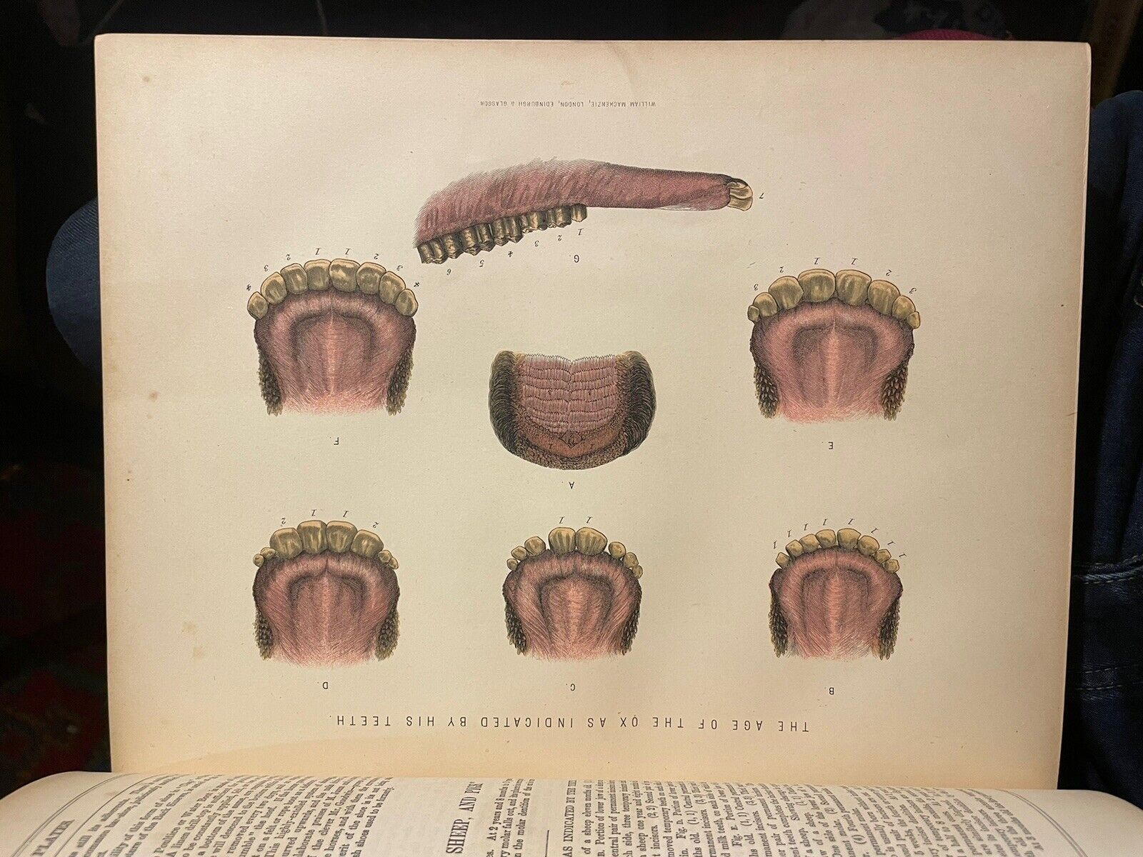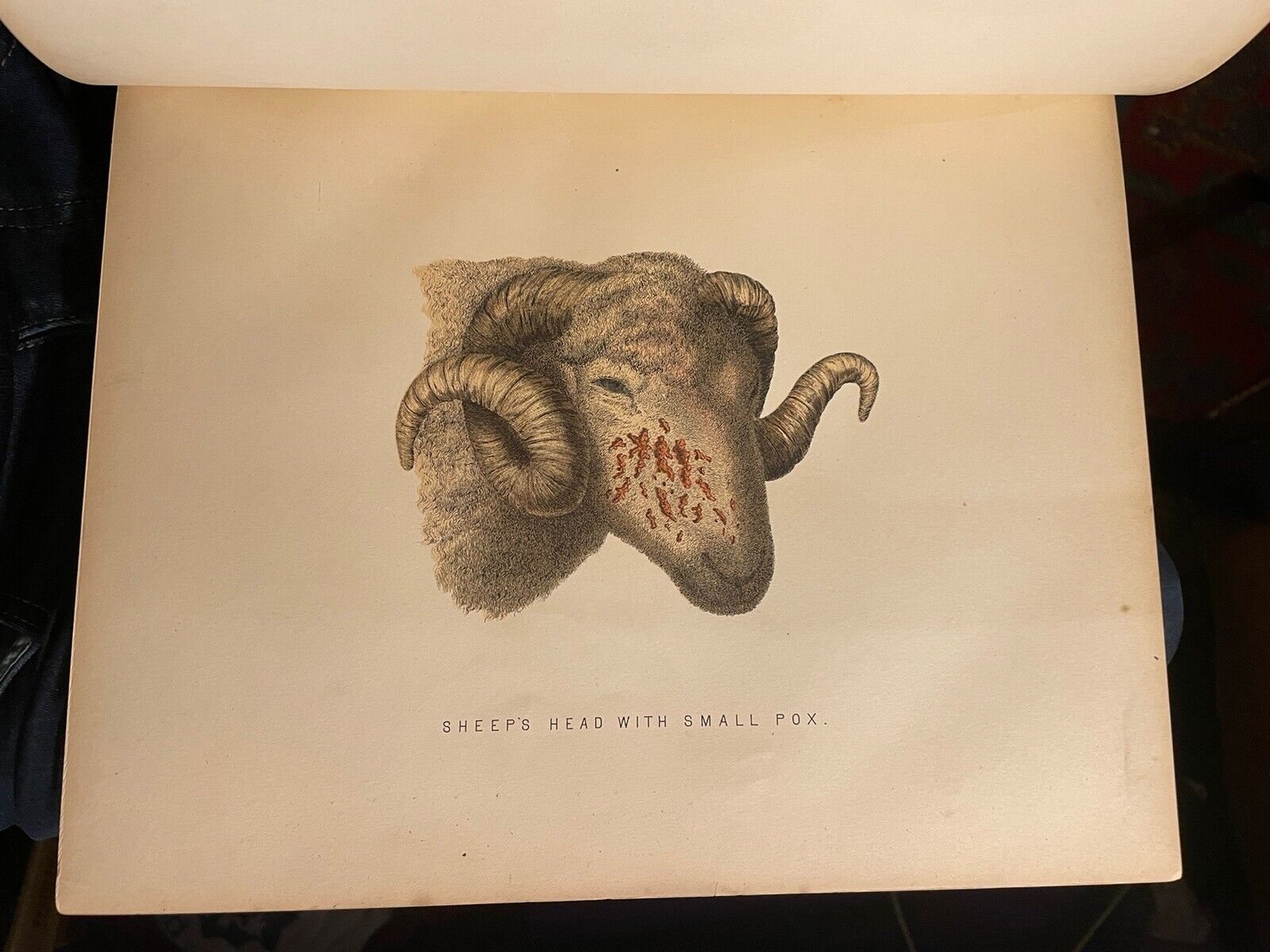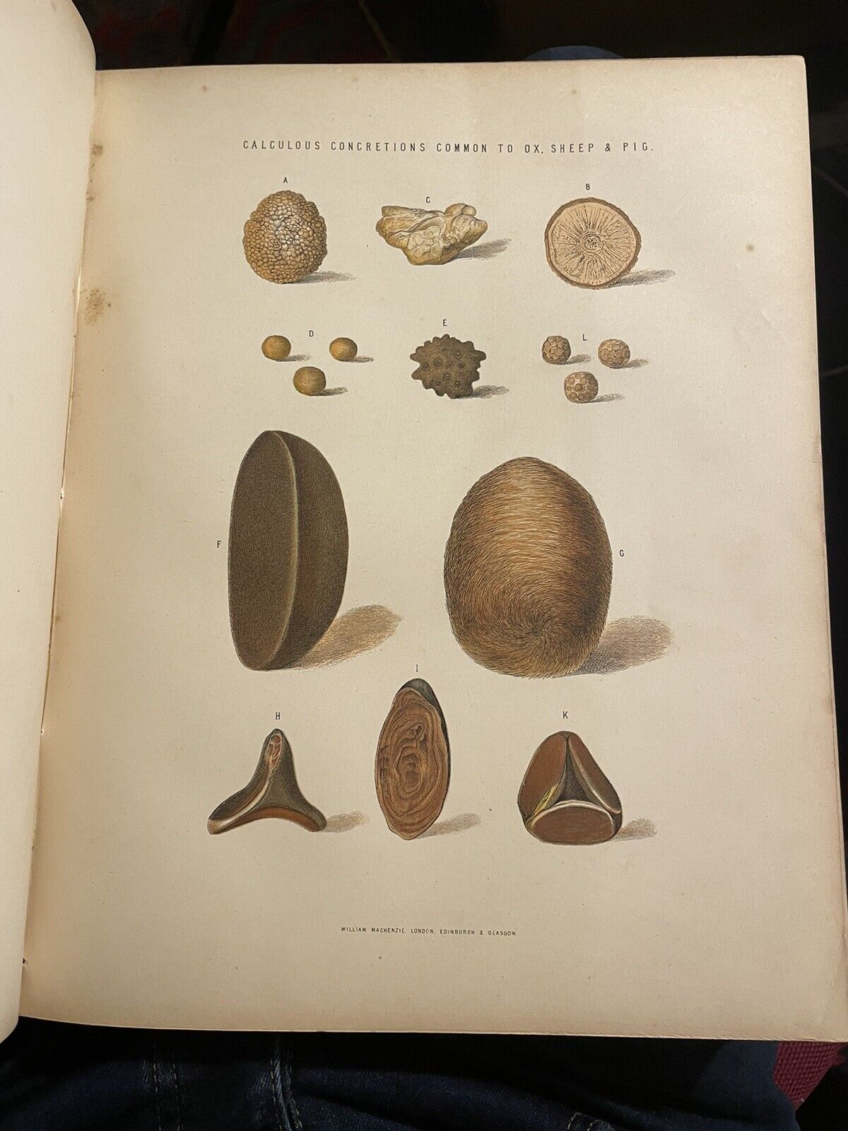 Published by William Mackenzie, London, undated, c1885. Large 4to, recently rebound in moire silk bookcloth, marble endpapers, vii, 536pp, 96pp. Lovely colour title page as well as a letterpress title page. With 14 colour plates and 14 anatomical plates. 5 sheep/pig plates.