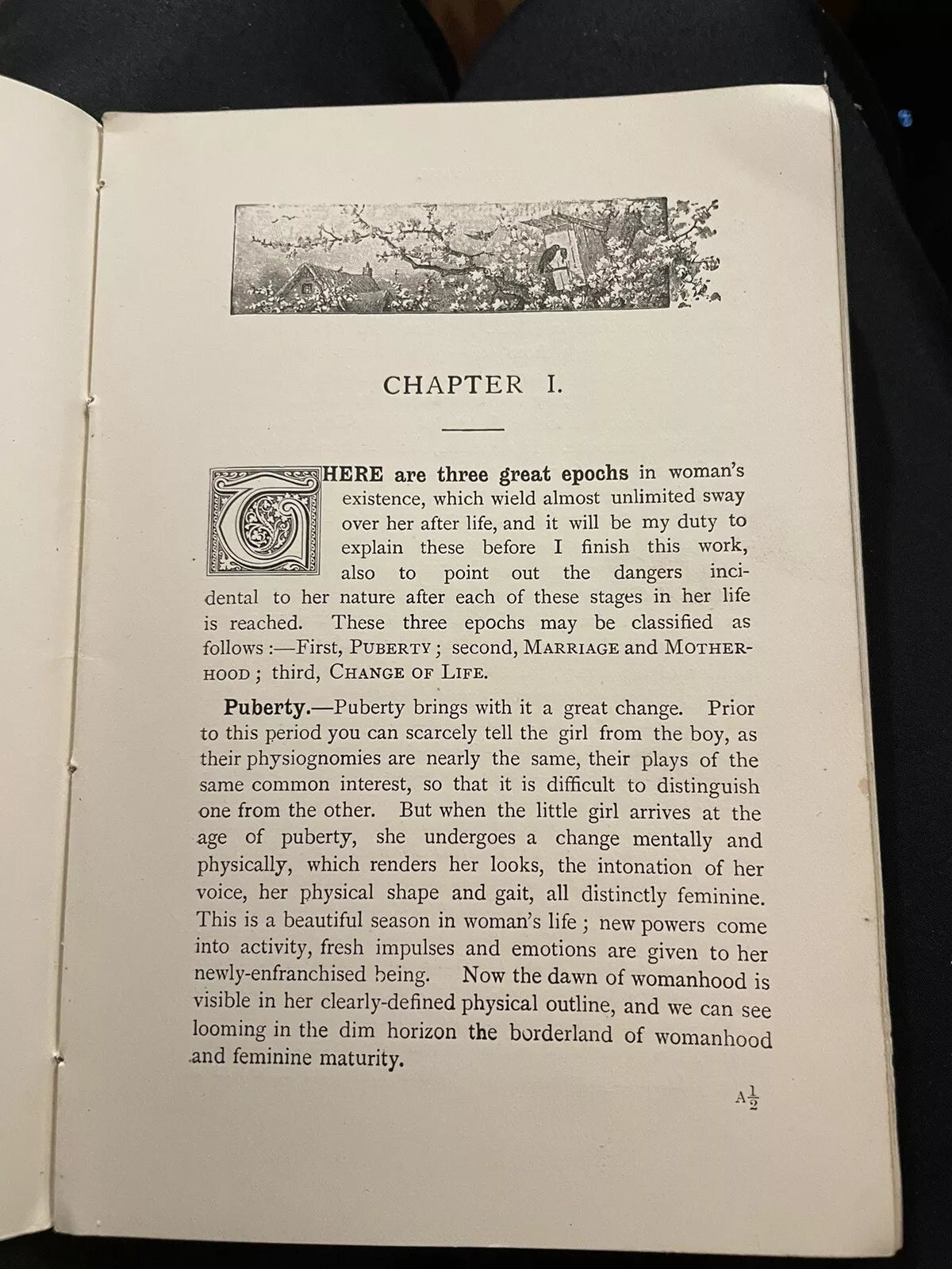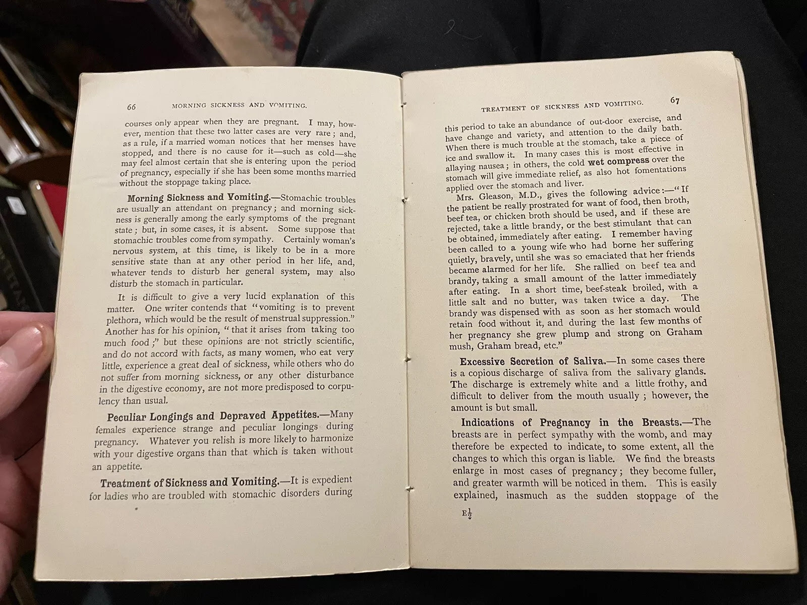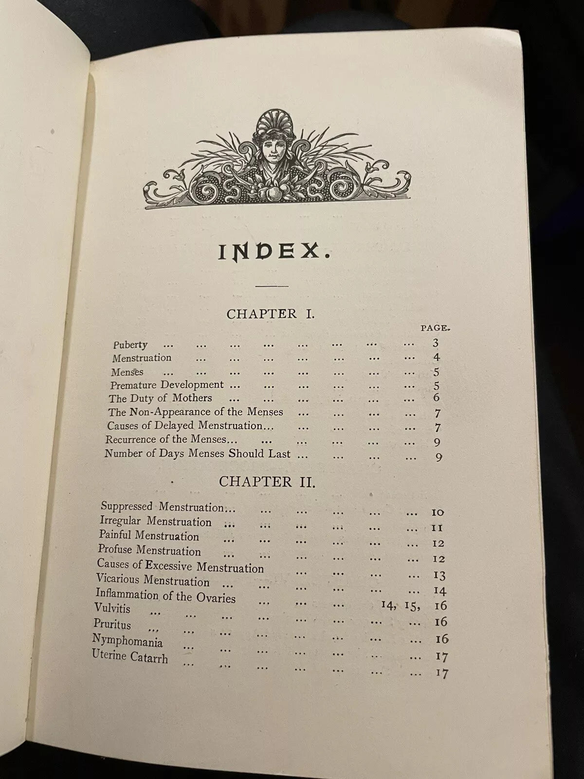 The work contains chapters on such topics as ‘Diseases of menstruation, and their treatment’, Diseases of the womb’, ‘Diseases of the ovaries’, ‘Procreation’, ‘Pregnancy’, ‘Conception’, and ‘Family Contentions,’ including allusions to criminal abortion. These chapters detail such complaints as ‘Mental Impressions during pregnancy affect offspring’ - apparently ‘Widows remarried sometimes bear children resembling their first husband’, ‘Intercourse during pregnancy’ - apparently ‘unnatural’, Nymphomania - ‘Females who suffer from this disease have frequently committed the grossest breaches of chastity, completely losing all control over their sexual feelings’ all of which is put down to self-abuse among other things. The whole contents are an amalgam of half truths stitched together into a quasi medical work.