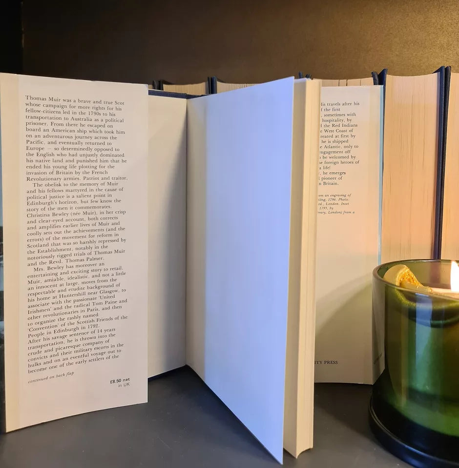 Edinburgh's horizon, but few know the story of the men it commemorates. Christina Bewley (nee Muir), in her crisp and clear-eyed account, both corrects and amplifies earlier lives of Muir and coolly sets out the achievements (and the errors) of the movement for reform in Scotland that was so harshly repressed by the Establishment, notably in the notoriously rigged trials of Thomas Muir and the Revd Thomas Palmer.