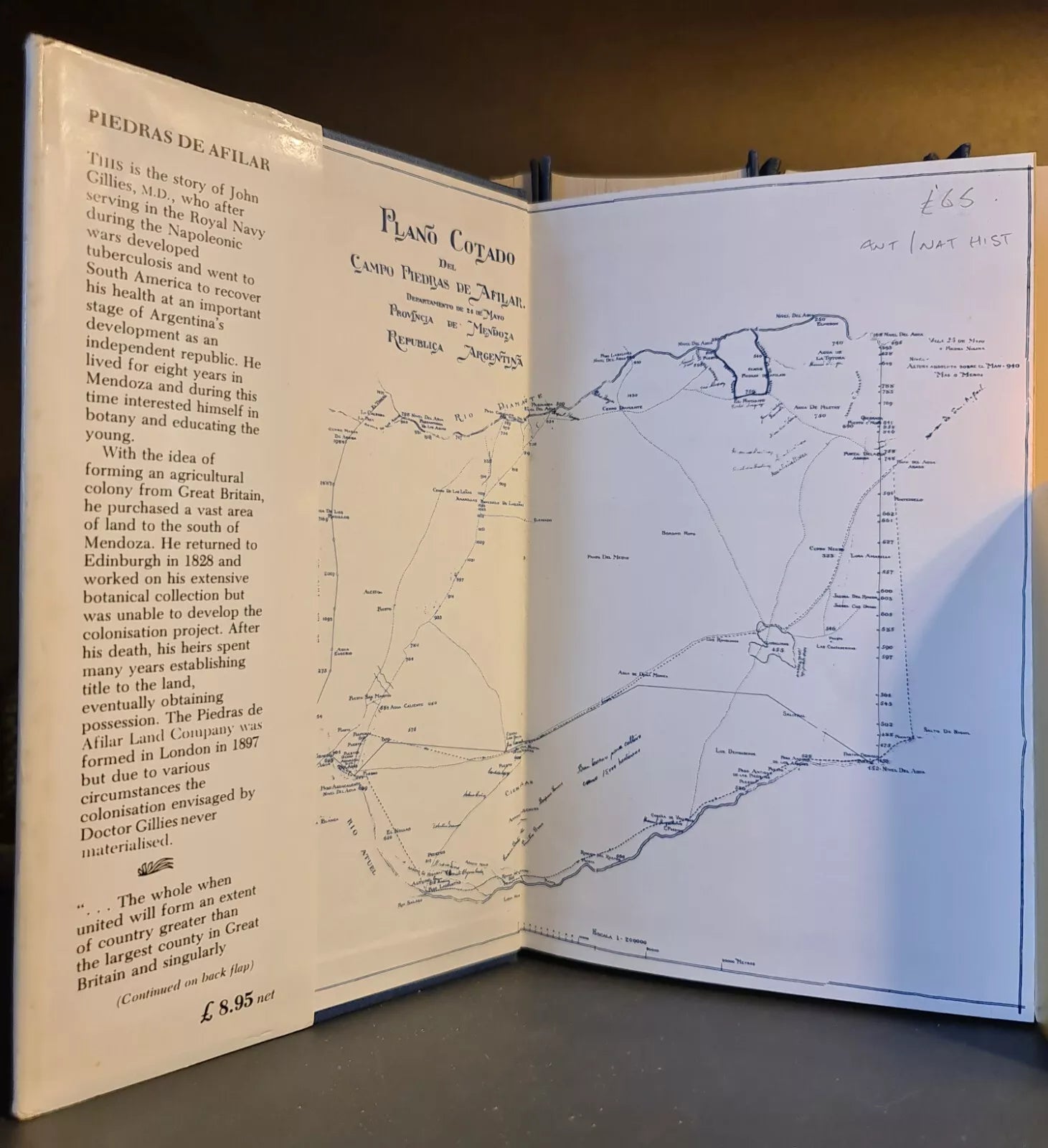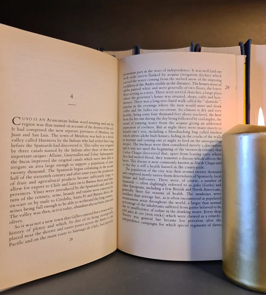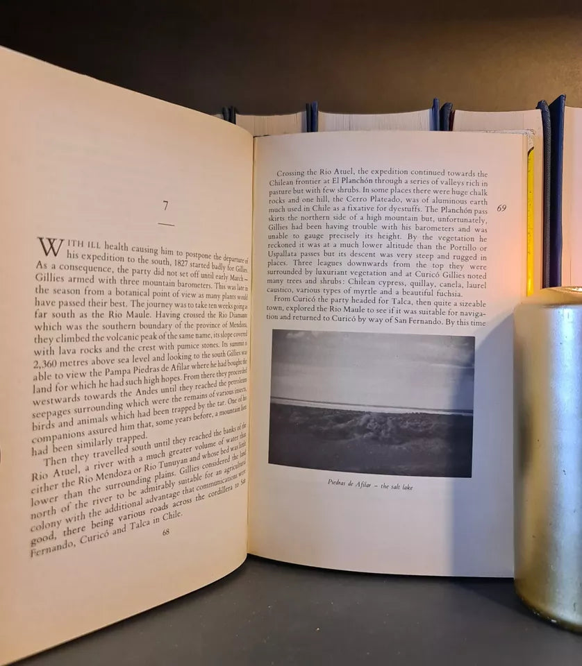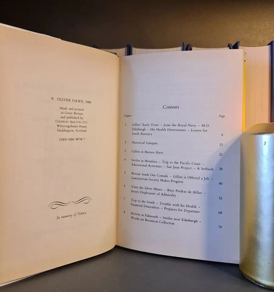 This is the story of John Gillies, M.D., who after serving in the Royal Navy during the Napoleonic wars developed tuberculosis and went to South America to recover his health at an important stage of Argentina's development as an independent republic. He lived for eight years in Mendoza and during this time interested himself in botany and educating the young. With the idea of forming an agricultural colony from Great Britain, he purchased a vast area of land to the south of Mendoza. He returned to Edinburgh in 1828 and worked on his extensive botanical collection but was unable to develop the colonisation project. After his death, his heirs spent many years establishing title to the land, eventually obtaining possession.