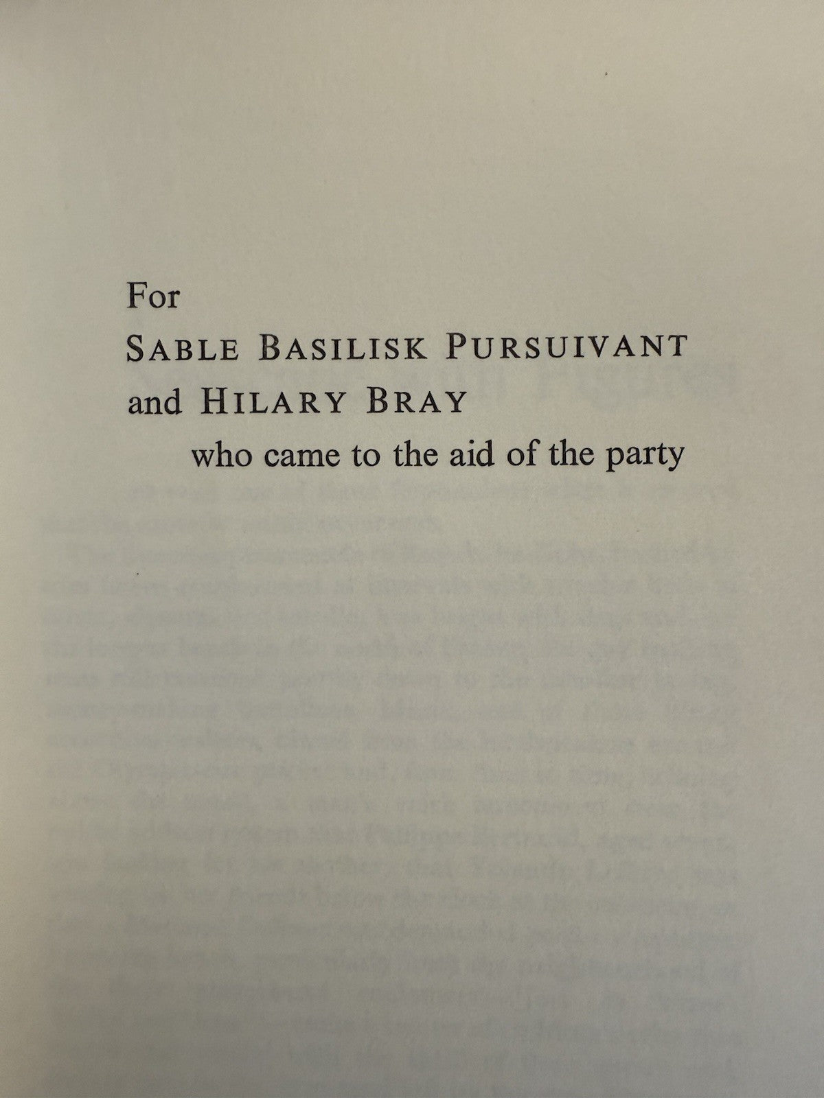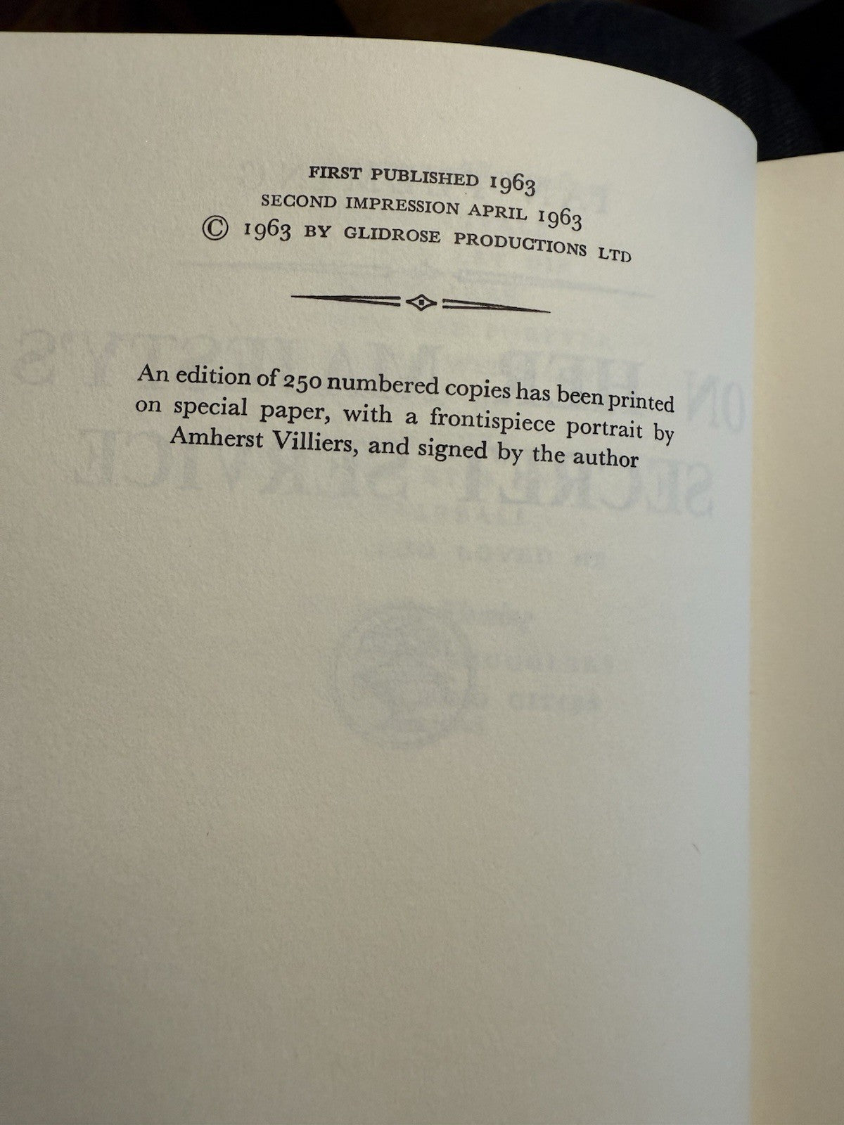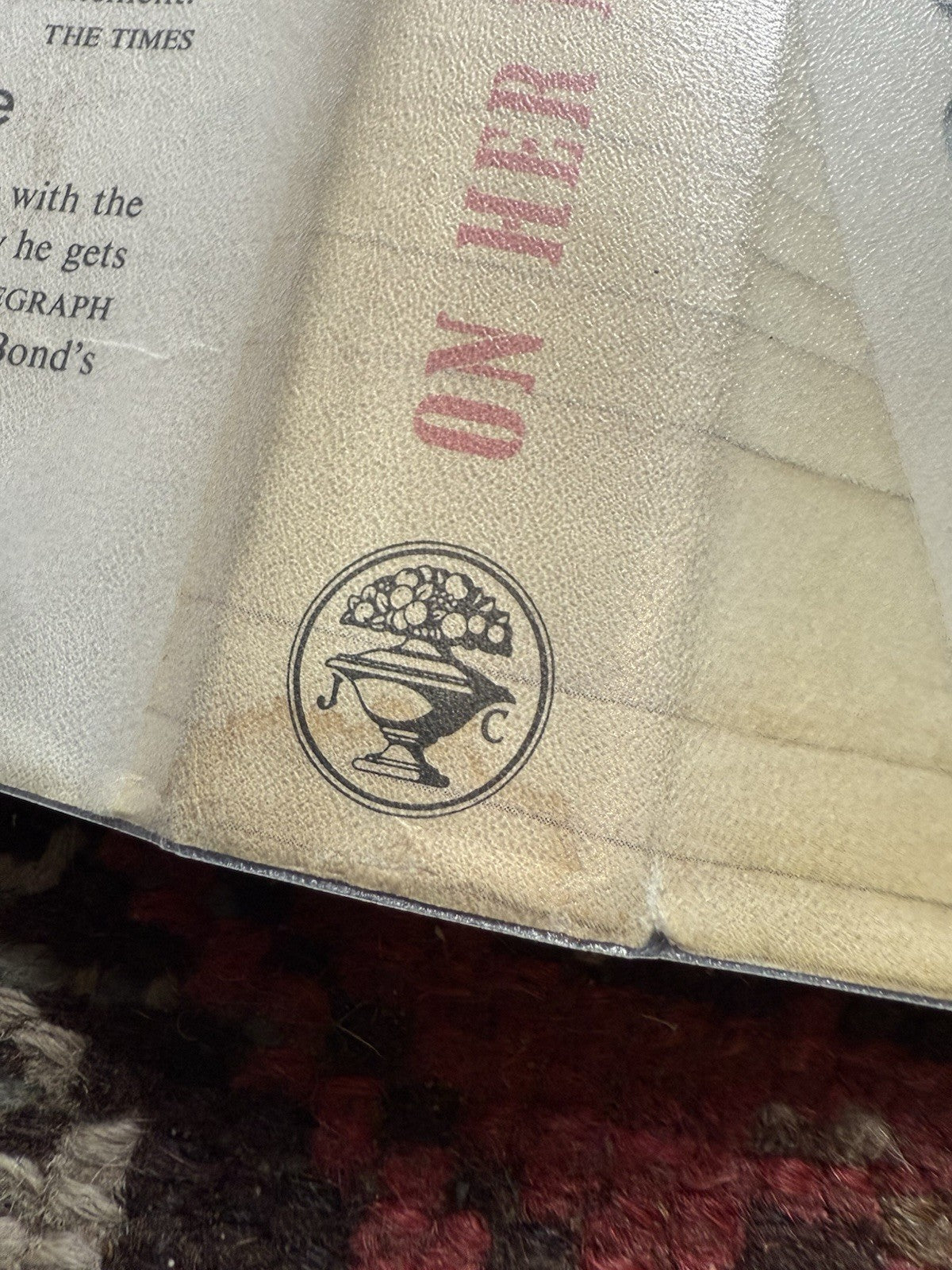 This book is not only signed by Ian Fleming but is also inscribed by the dedictee, the heraldry expert who directly inspired the character Sable Basilisk. Mirrlees, the Rouge Dragon of London's Corporation of Kings, was consulted extensively by Fleming on background information pertaining to heraldry prior to the composition of On Her Majesty's Secret Service. Mirrlees "provided the relevant Bond ancestry including the real family motto 'The World Is Not Enough', and produced a family crest for the character. In acknowledgement the book is dedicated to 'Sable Basilisk Pursuivant'—Fleming's guarded reference to the Rouge Dragon which would allow him to keep his anonymity (Gilbert, p. 351).