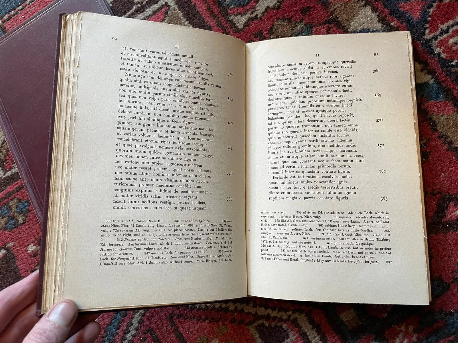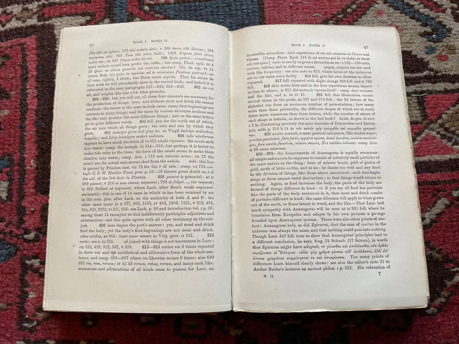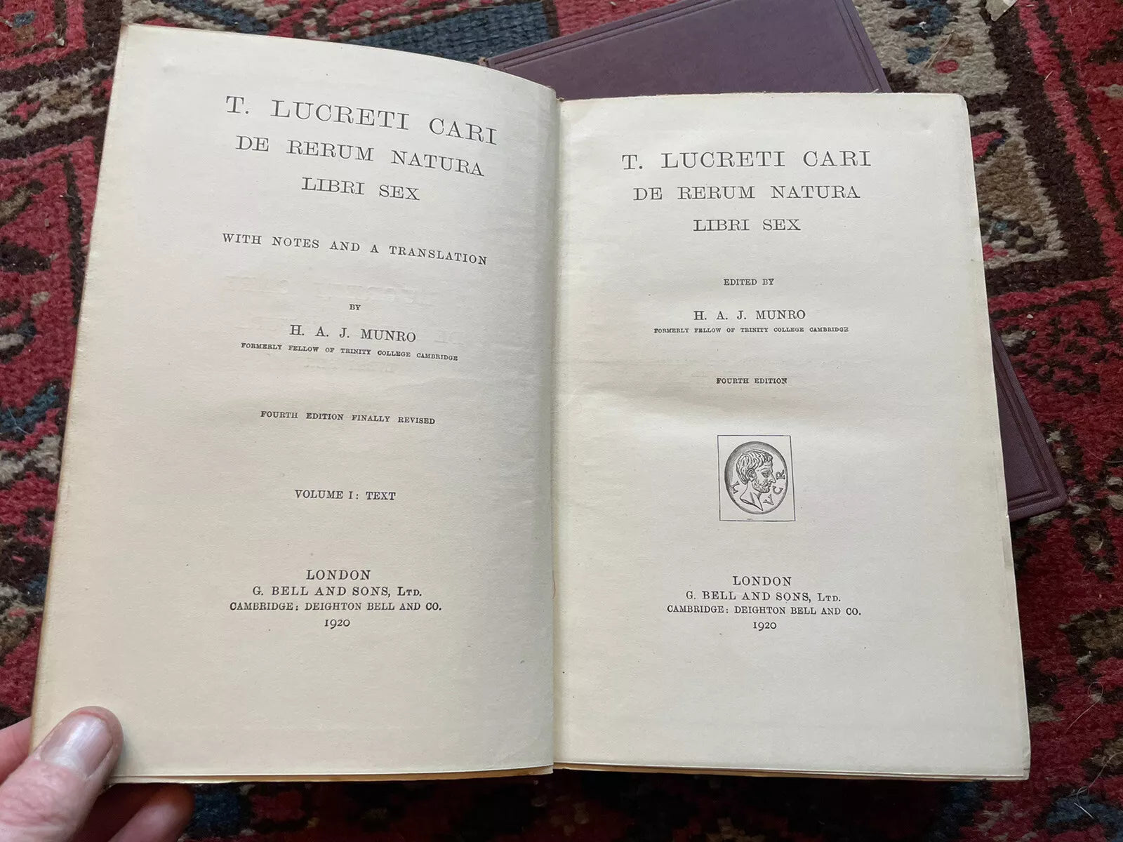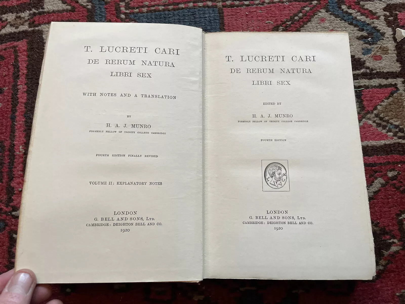 Featuring text and translation from Latin from the work of Lucretius, a Roman philosopher and poet. His only known work has been translated into English as On The Nature of Things. The poem focuses on the ideas of Epicureanism, which features ideas of cosmology and atomism. The poem argues that the universe operates on chance, rather than intervention of the Roman divinities.