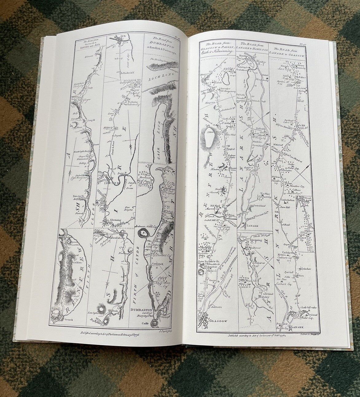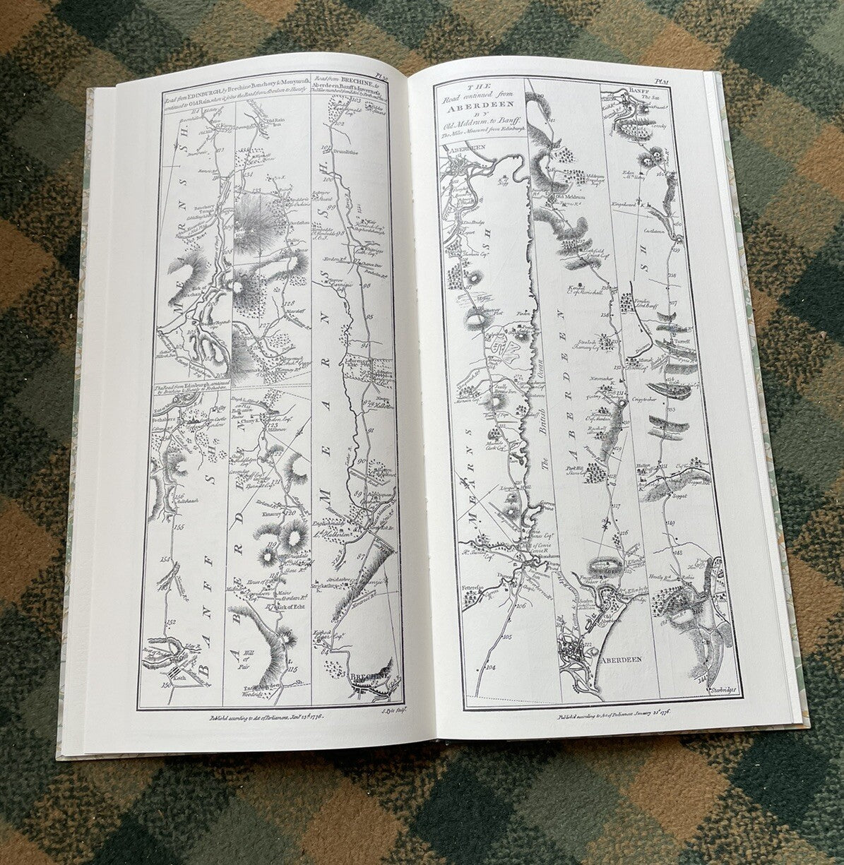 Although John Ogilby had published a strip road atlas for England and Wales a century earlier, George Taylor and Andrew Skinner's volume was essentially Scotland's first road atlas. It consists of 61 plates showing roads across Scotland at the one-inch to the mile scale, covering some 3,000 miles in total, with each page divided into three vertical strips of a particular road. The volume was designed to be folded into a portable accessory for the growing number of travelers and visitors in Scotland.