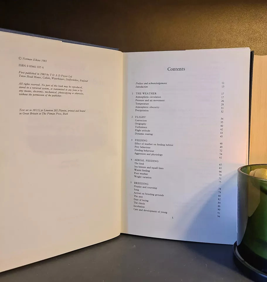 The chapter titles indicate the book's range and interest: The Weather, Flight; Feeding: Aerial Feeding, Breeding-Comfort; Migration; Migrational Drift and Displacement; Vagrancy; Migration of Soaring Birds; Extreme Weather; Seabirds. From such themes the author, professional meteorologist, has composed an intriguing and instructive study (and an introduction to meteorology) of exceptional usefulness to birdwatchers and ornithologists.